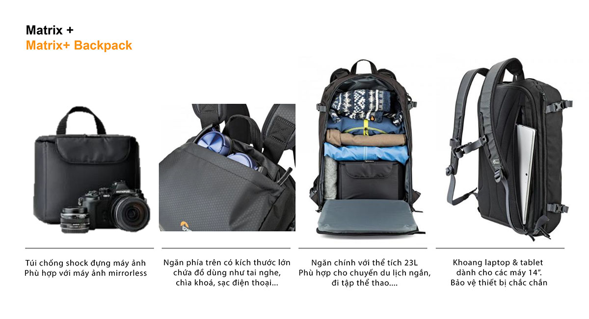 Lowepro Matrix BP 23L là một Balo đa năng hoàn hảo cho những người yêu thích nhiếp ảnh và cần đựng laptop cùng với các thiết bị khác. Với sức chứa đáp ứng được laptop 14 inch, 1 body mirrorless và 1 lens, sản phẩm đã giúp cho việc vận chuyển thiết bị trở nên dễ dàng hơn bao giờ hết. Matrix cũng là một balo máy ảnh mirrorless nhỏ gọn phù hợp cho những chuyến du lịch ngắn ngày.