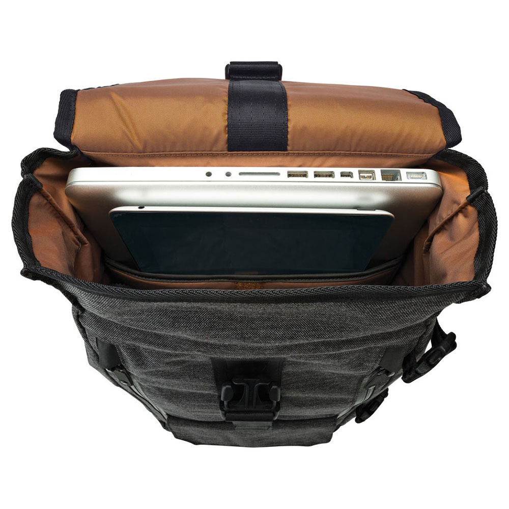 Nắp đậy lớn sẽ bảo vệ các thiết bị bên trong ba lô tránh các tác nhân từ môi trường, nắp đậy có khóa chắc chắn với thao tác đóng mở tiện lợi. Nắp túi được thiết kế ngăn phụ kiện có khóa kéo để cất các vật dụng nhỏ như điện thoại, chìa khóa, ví…. Phía dưới nắp túi là một ngăn nhỏ có dây buộc, móc khóa và một ngăn ẩn bên có khóa kéo phù hợp đựng tài liệu hoặc phụ kiện.