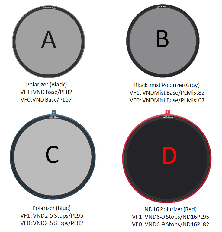 Một bộ lọc có thể phù hợp với các loại mount khác nhau. VF0 tương thích với ống kính 52/55/58/62/67mm. VF1 tương thích với ống kính 67/72/77/82mm.