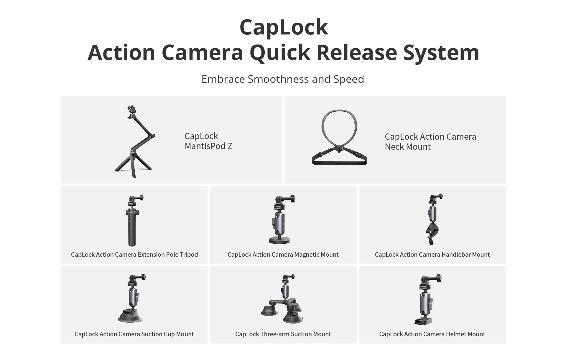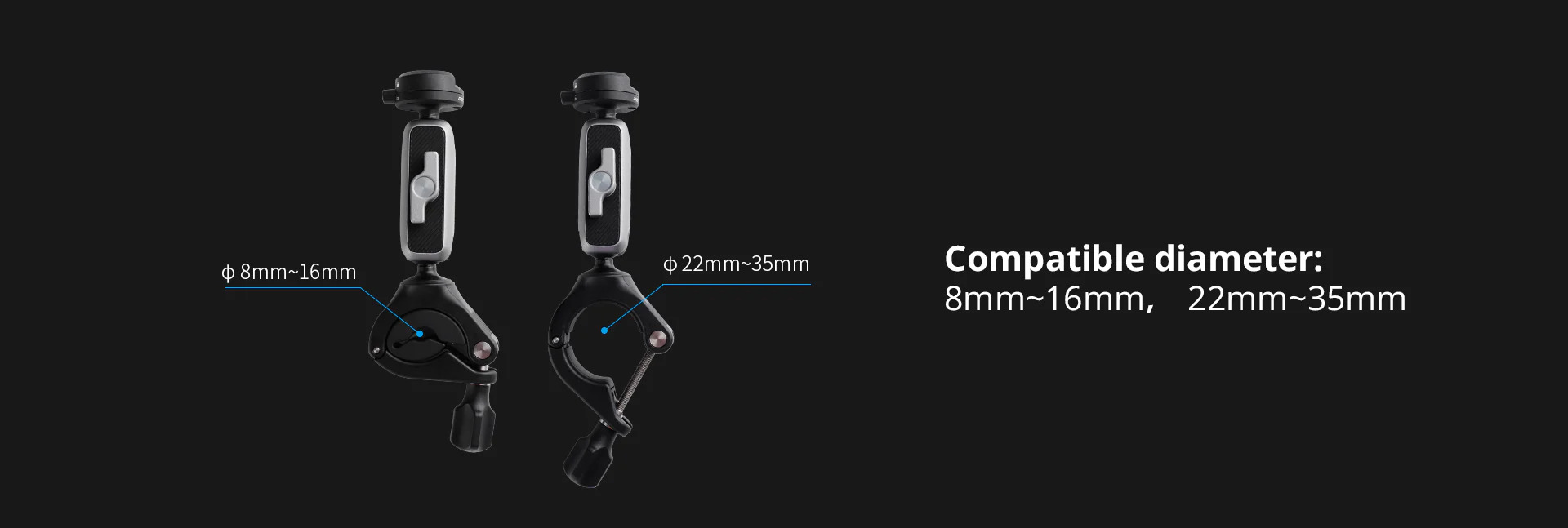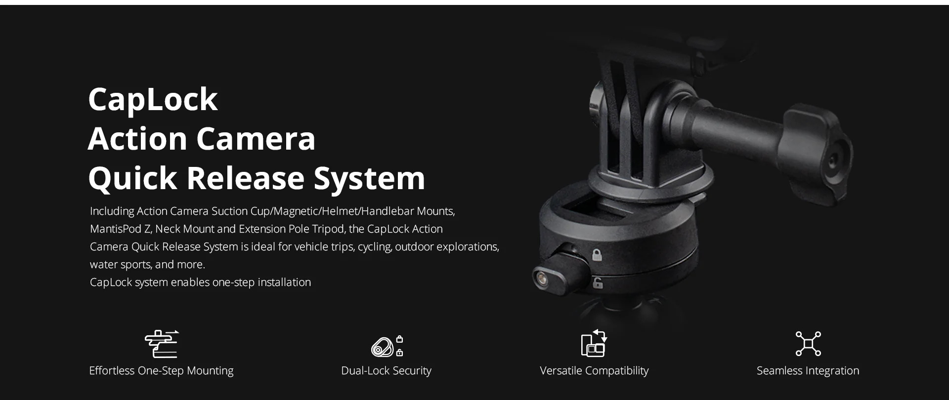 Điểm nổi bật của CapLock Handlebar Mount là cơ chế khóa kép giúp gia tăng độ ổn định, hạn chế rung lắc trong quá trình di chuyển. Sản phẩm tương thích với nhiều thiết bị nhờ đầu chuyển đổi ¼’’, hỗ trợ gắn action camera, điện thoại thông minh và các thiết bị khác. Phạm vi kẹp linh hoạt từ 8–16mm đến 22–35mm cho phép sử dụng trên nhiều loại ghi đông hoặc ống trụ khác nhau. Hai đầu bi xoay độc lập 360° cho phép quay toàn cảnh dễ dàng, mang lại trải nghiệm ghi hình linh hoạt và chuyên nghiệp trong mọi tình huống.
