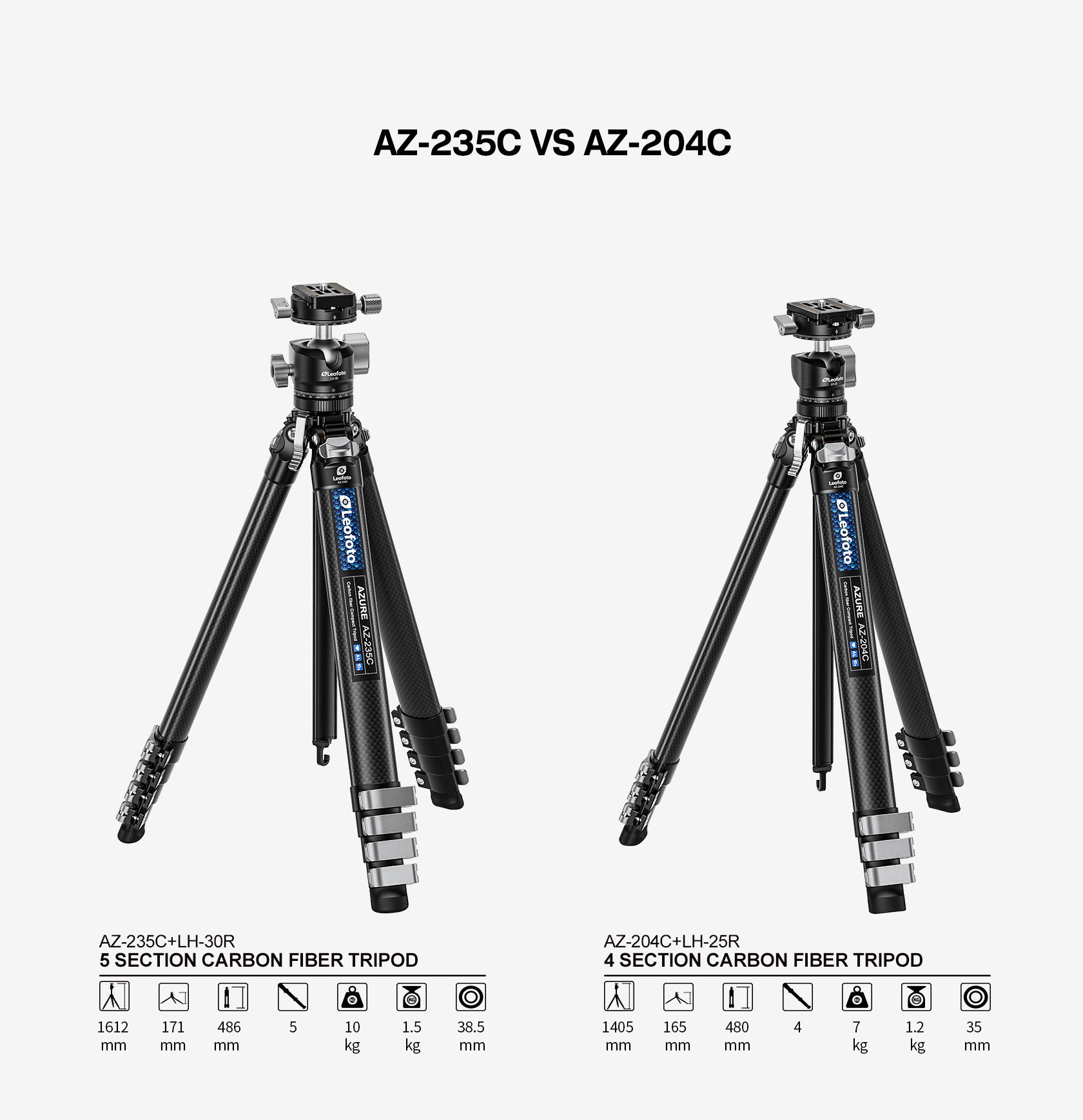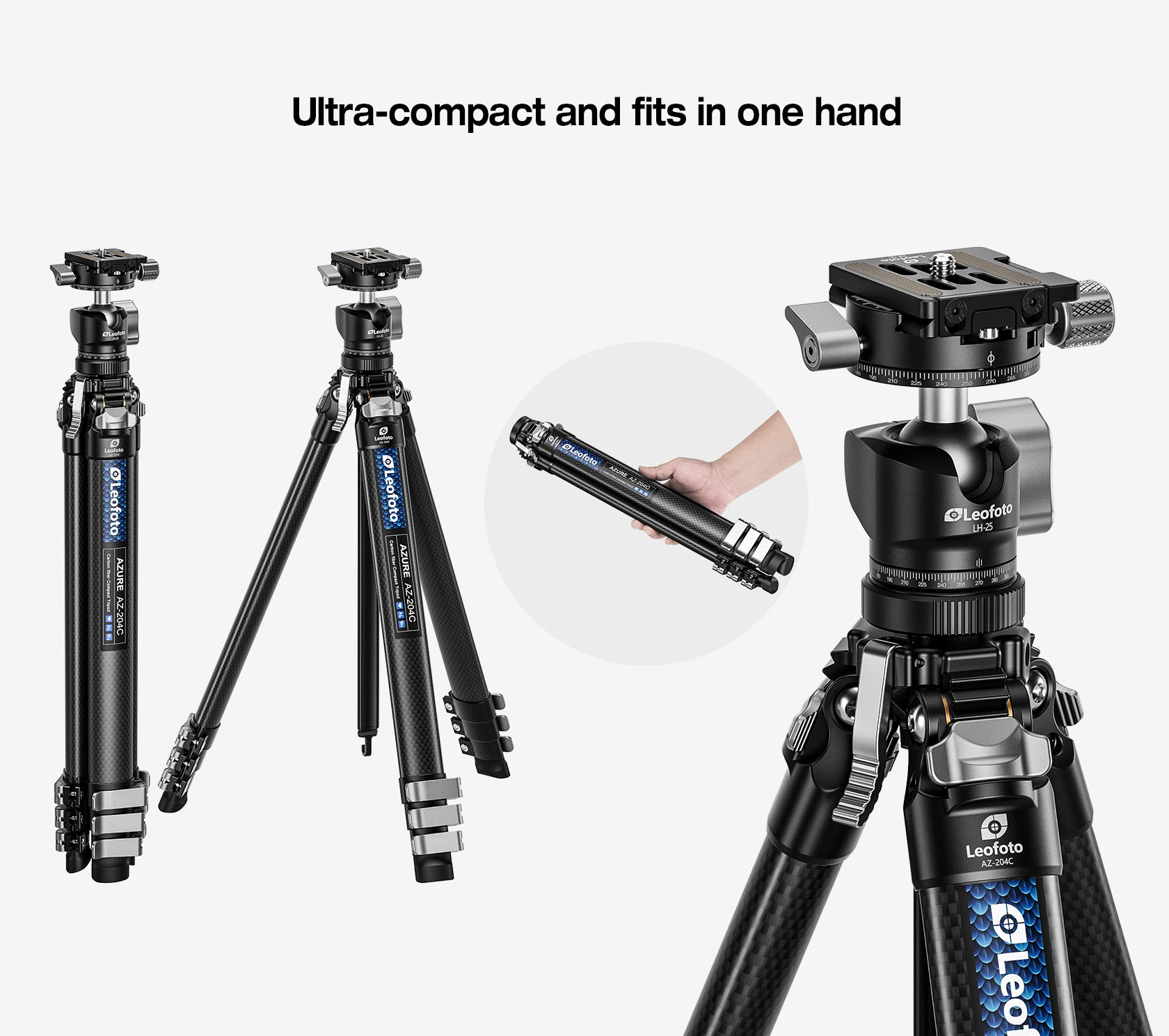 Leofoto AZ-204C là mẫu tripod du lịch được thiết kế dành cho những nhiếp ảnh gia muốn độ vững chắc tối đa mà không phải mang vác cồng kềnh. Toàn bộ thân tripod được chế tạo từ sợi carbon 10 lớp kết hợp hợp kim nhôm 6061-T6 siêu bền, giúp trọng lượng chỉ 1,2 kg nhưng vẫn có thể chịu tải đến 7 kg đủ vững để gắn máy ảnh full-frame cùng ống kính lớn. Tripod có chiều cao tối đa 140,5 cm, gấp gọn chỉ còn 48 cm và có thể hạ thấp xuống 16,5 cm, lý tưởng cho cả chụp phong cảnh lẫn macro cận cảnh.