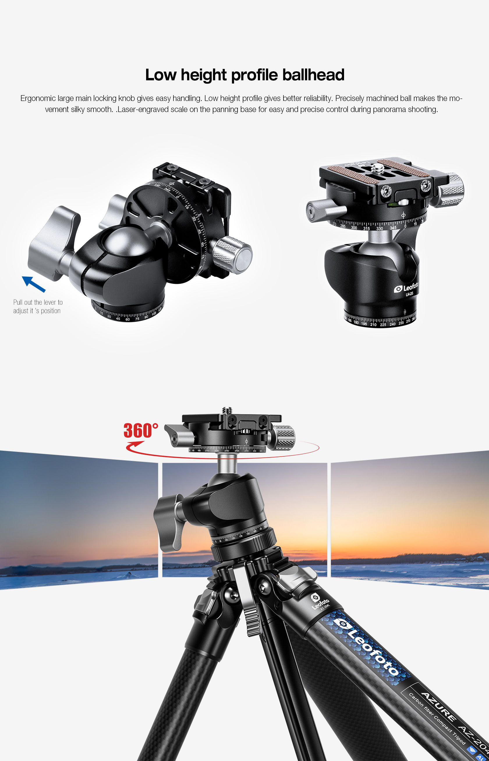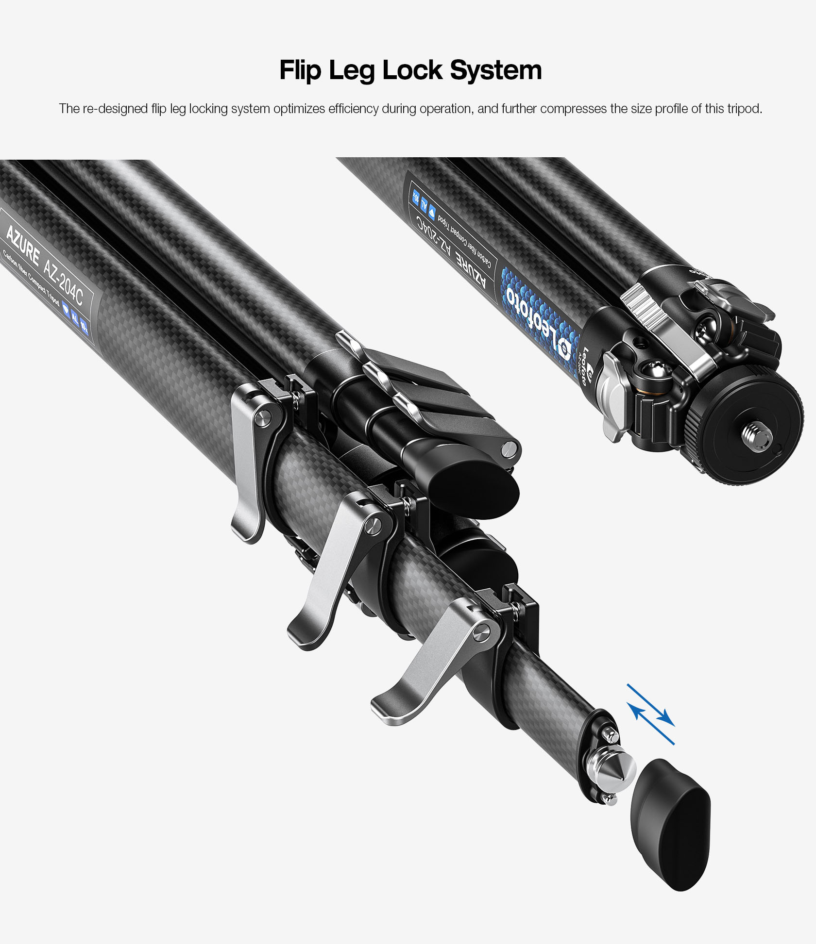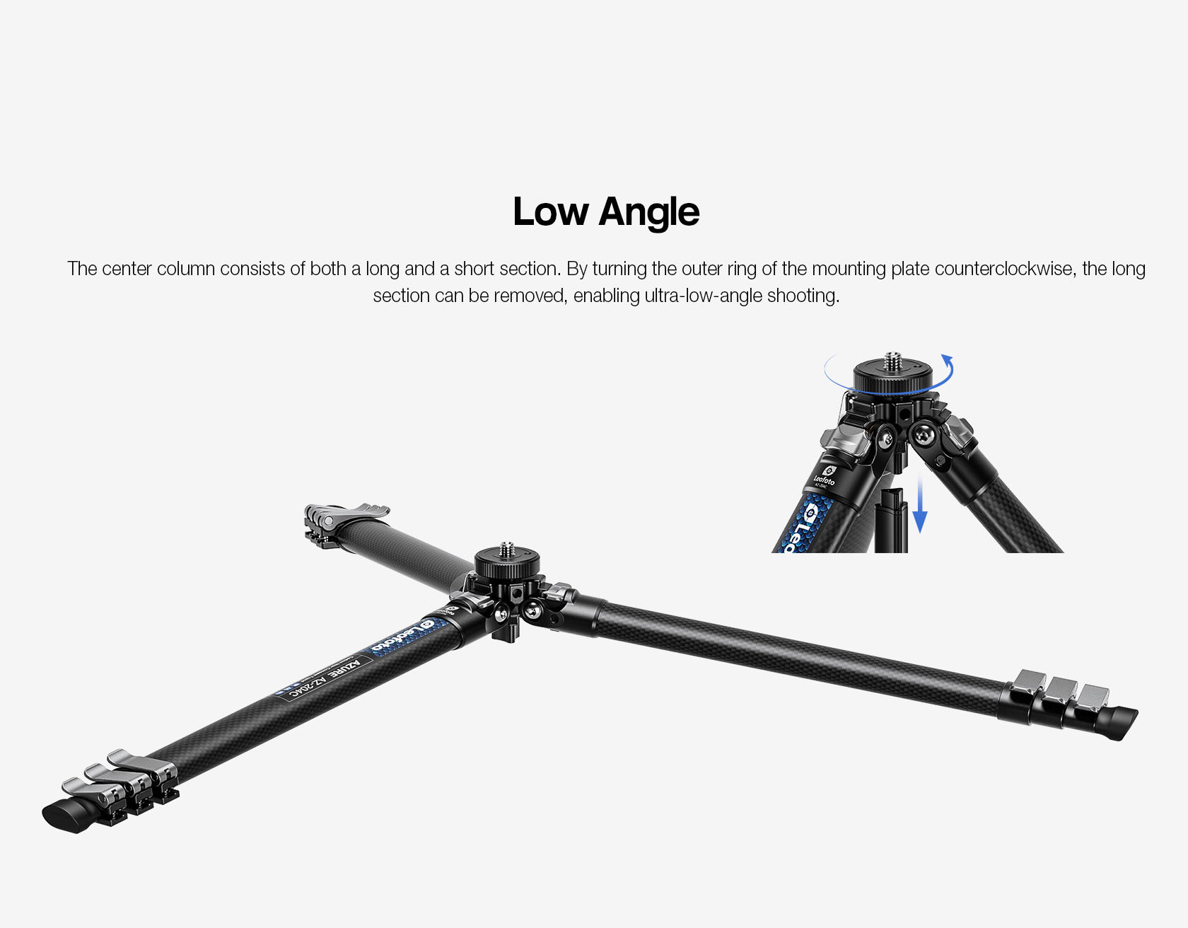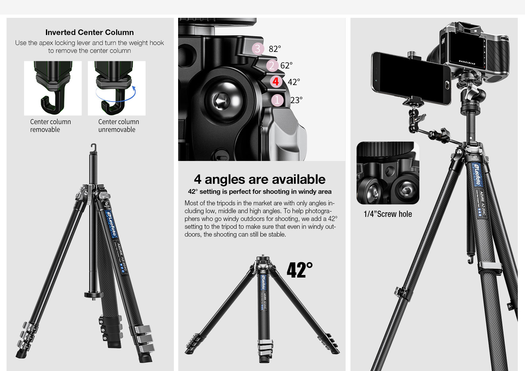 Leofoto trang bị cho AZ-204C trụ giữa 2 đoạn: một trụ giữa ngắn và một trụ giữa có thể đảo ngược, giúp người dùng dễ dàng chụp góc thấp, chụp từ trên cao hoặc chụp macro chi tiết. Ngoài ra, tripod còn có ngàm ren 1/4" để gắn phụ kiện như đèn LED, micro hoặc màn hình rời, cùng móc đối trọng giúp tăng độ ổn định khi gió lớn.