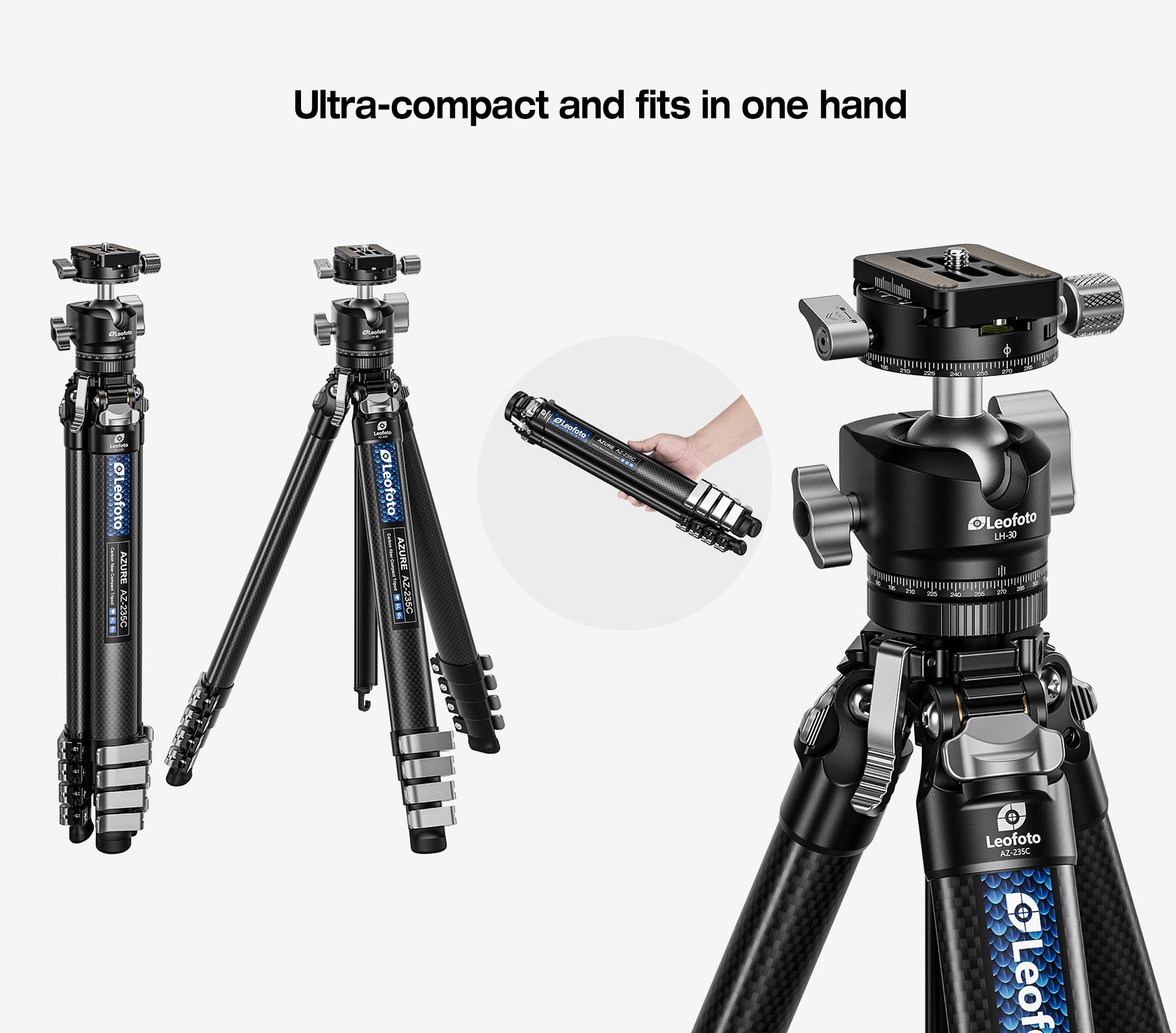 Tripod Azure AZ-235C đi kèm đầu bi LH-30R nhỏ gọn nhưng mạnh mẽ, nặng chỉ 1,5 kg song vẫn chịu tải tối đa tới 10 kg – đủ cho các bộ máy ảnh full-frame cùng ống kính tele. Tripod có chiều cao tối đa 161,2 cm, hạ thấp chỉ còn 17 cm và gấp gọn trong 48,6 cm, rất tiện khi du lịch, chụp phong cảnh hoặc macro thiên nhiên.