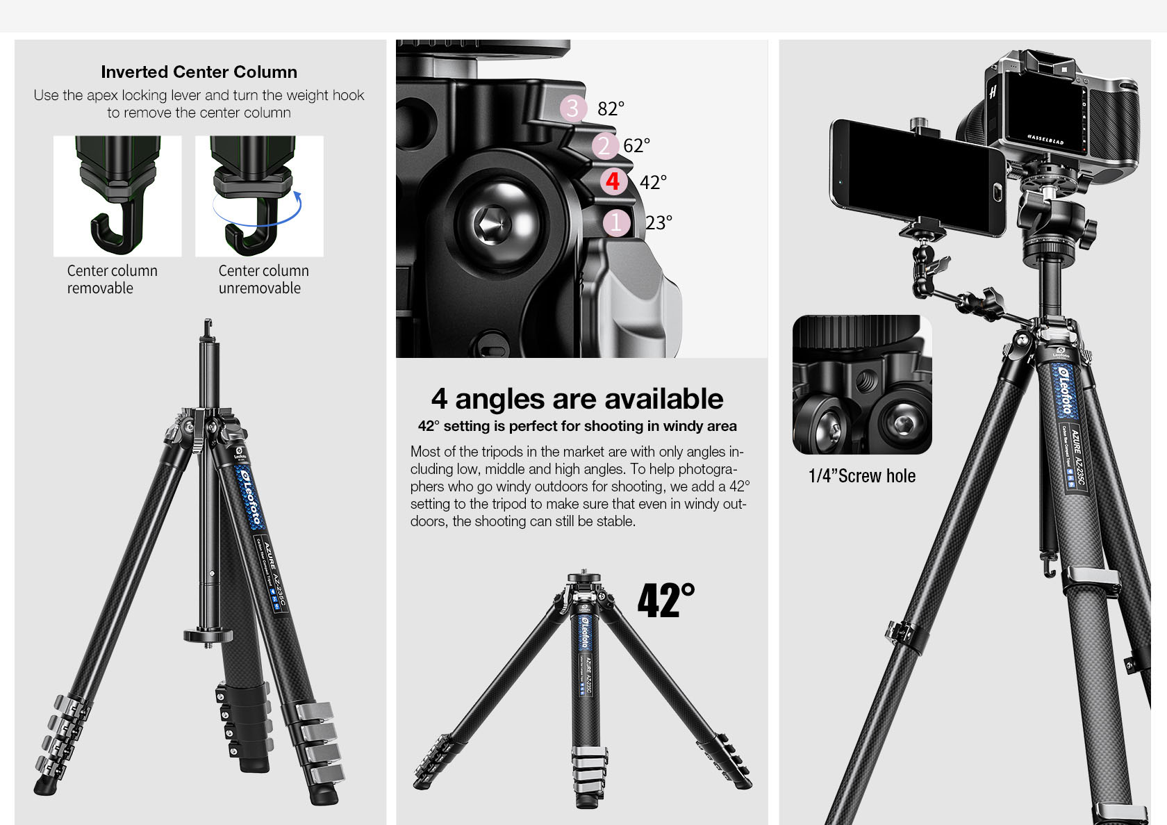 4 Góc chụp với trụ giữa 2 đoạn, móc đối trọng và ren gắn phụ kiện