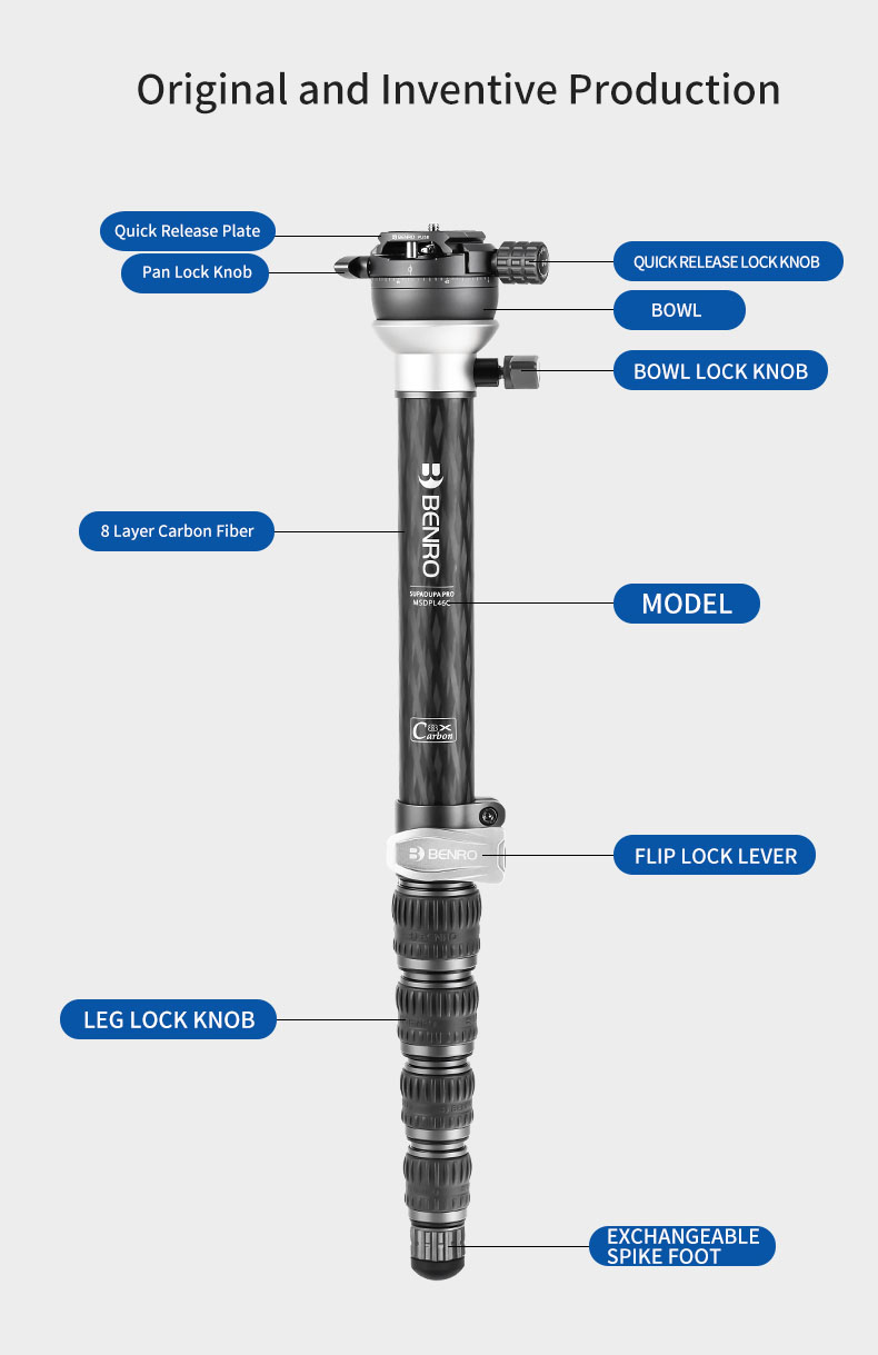 Benro Monopod Supadupa MSD46C / MSDPL46C là chân máy monopod được làm bằng sợi carbon 8 lớp, chống nước chống mài mòn. Đầu chân kiểu bát giác với khả năng quay 360 độ và nghiêng 20 độ, cho phép chụp toàn cảnh linh hoạt.