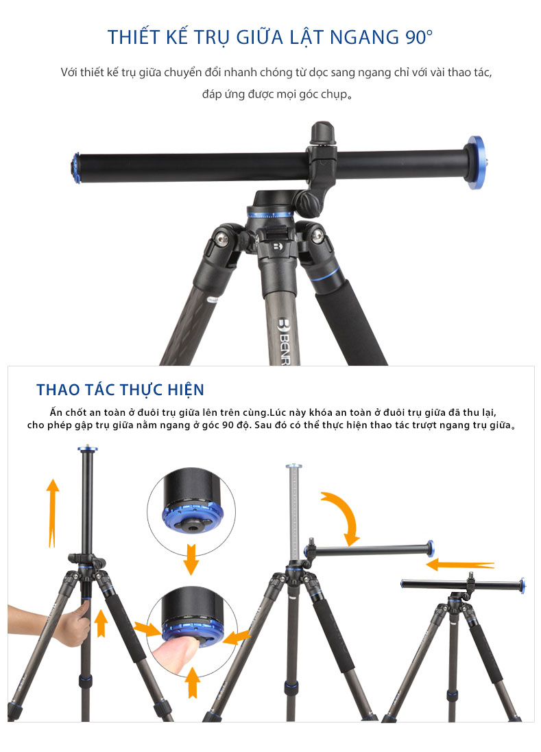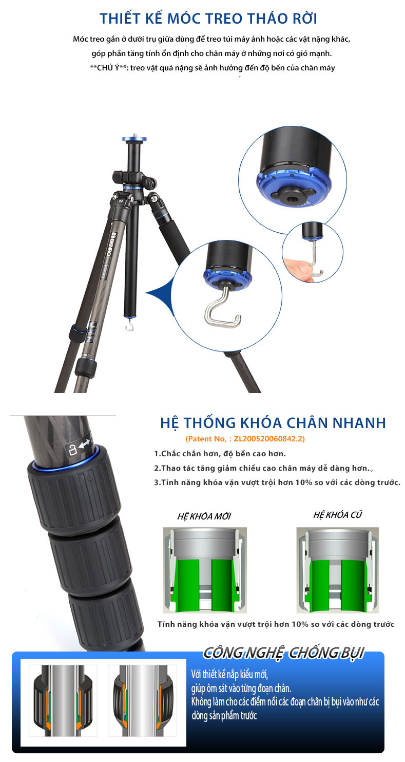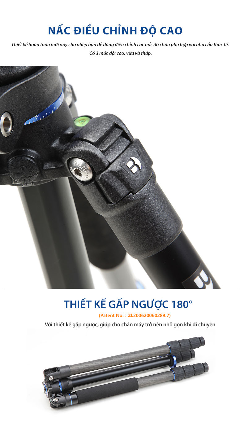 Cả hai dòng sản phẩm đều sở hữu thiết kế gập ngược gọn gàng, chân 4 đoạn với khóa xoay kín chống bụi và ẩm, cùng khả năng chuyển đổi thành mono pod tiện dụng. Trục trung tâm với tính năng cánh tay ngang linh hoạt giúp tripod trở thành công cụ lý tưởng cho các nhu cầu chụp hình sáng tạo. Sản phẩm đi kèm đầu bi chất lượng cao, túi đựng và chân đinh thay thế, mang lại sự ổn định trên mọi địa hình.