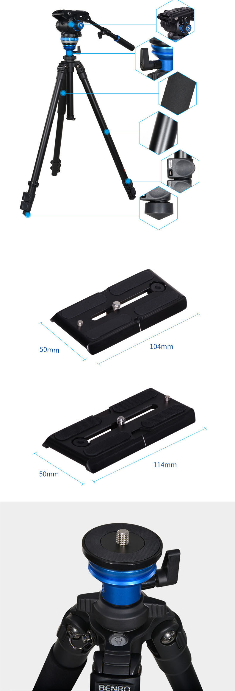 BENRO trong quá trình nghiên cứu, phát triển hệ thống và các thiết bị nâng đỡ máy quay và máy ảnh, đã phát hiện chân máy ảnh và chân máy quay có rất nhiều điểm tương đồng, có thể bổ trợ lẫn nhau, cuối cùng BENRO đã nghiên cứu, phát triển cho ra một loại chân máy quay với các ưu điểm sau: linh động, nhỏ gọn như chân máy ảnh, nhưng đồng thời cũng mang tính chuẩn xác, ổn định và có lực hãm tốt như chân máy quay thông thường.