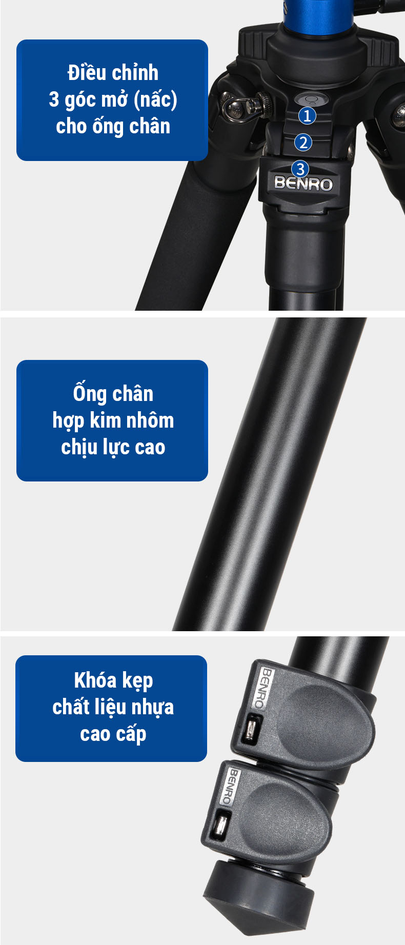 Ống chân làm bằng chất liệu hợp kim nhôm nhập khẩu có bề mặt nhẵn bóng, khả năng chịu lực cao, chịu mài mòn tốt, là cở sở vững chắc cho một chân máy quay cao cấp.