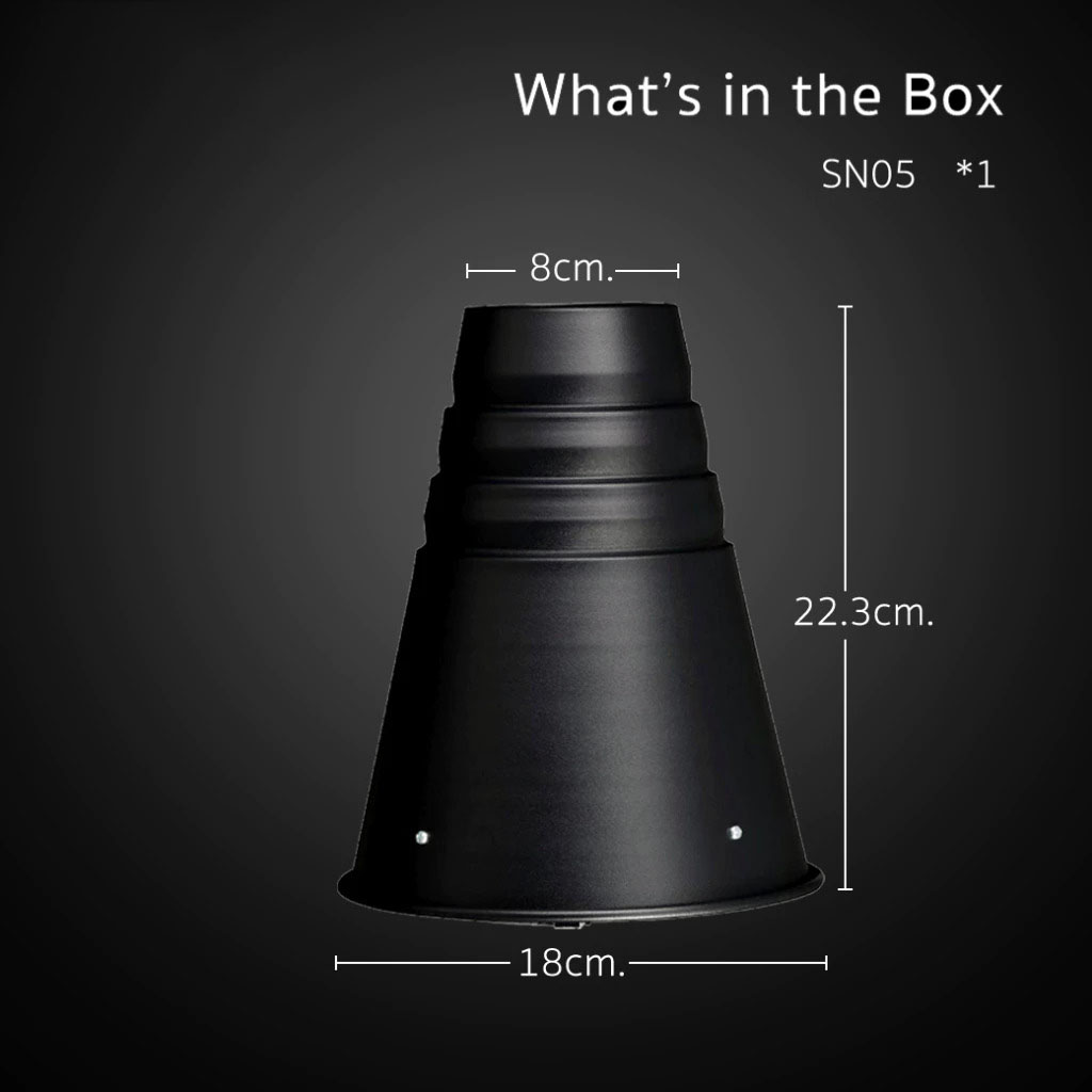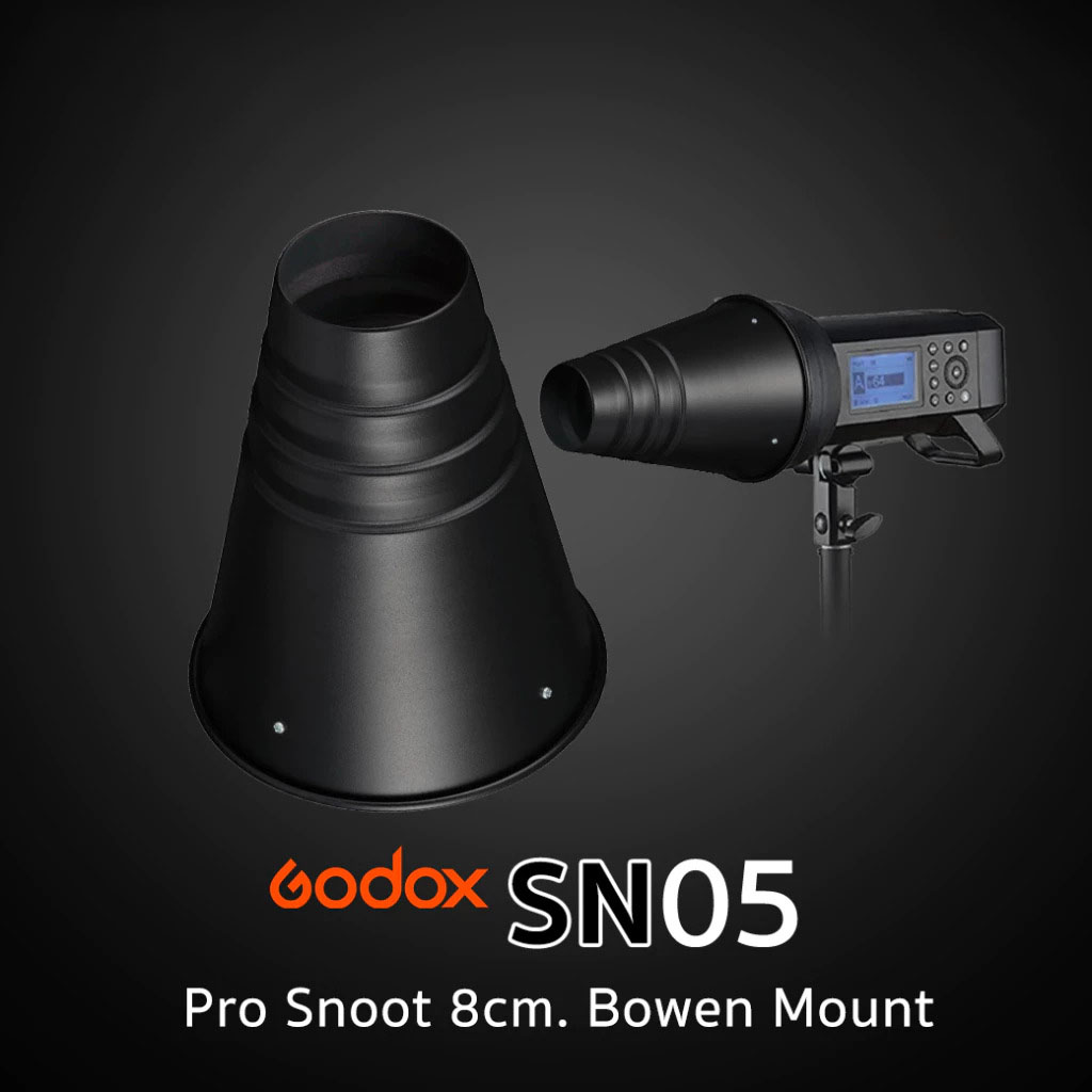 Godox SN-05 là Choá gom sáng (Pro Snoot) ngàm Bowens được thiết kế cho các đèn monolight của Godox cũng như các đèn flash từ các nhà sản xuất sử dụng ngàm Bowens, chóa chiếu sáng dài 3,1 inch (8 cm) này tạo ra chùm sáng hẹp để phân phối ánh sáng từ các đầu đèn tương thích.