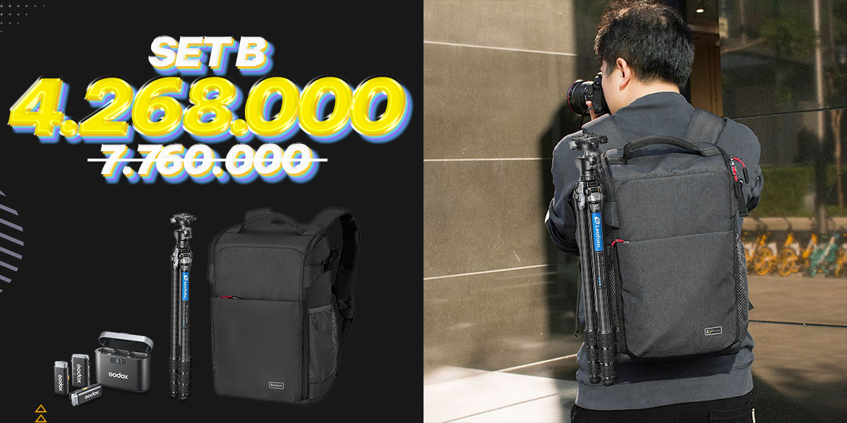 B: Balo máy ảnh Companion (Dark grey) - B380 (Xem SP) + Chân máy ảnh Tripod Leofoto Mr.Y (đen) - LY-224C+LH-25R (Xem SP) + Micro không dây Godox - WEC Kit 2 (Xem SP)