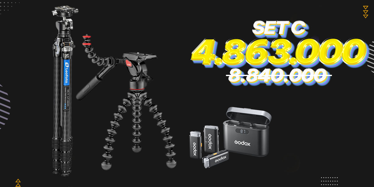 C: Chân máy Joby Gorillapod 3K Video PRO - JB01562 (Xem SP) + Chân máy ảnh Tripod Leofoto Mr.Y (đen) - LY-224C+LH-25R (Xem SP) + Micro không dây Godox - WEC Kit 2 (Xem SP)