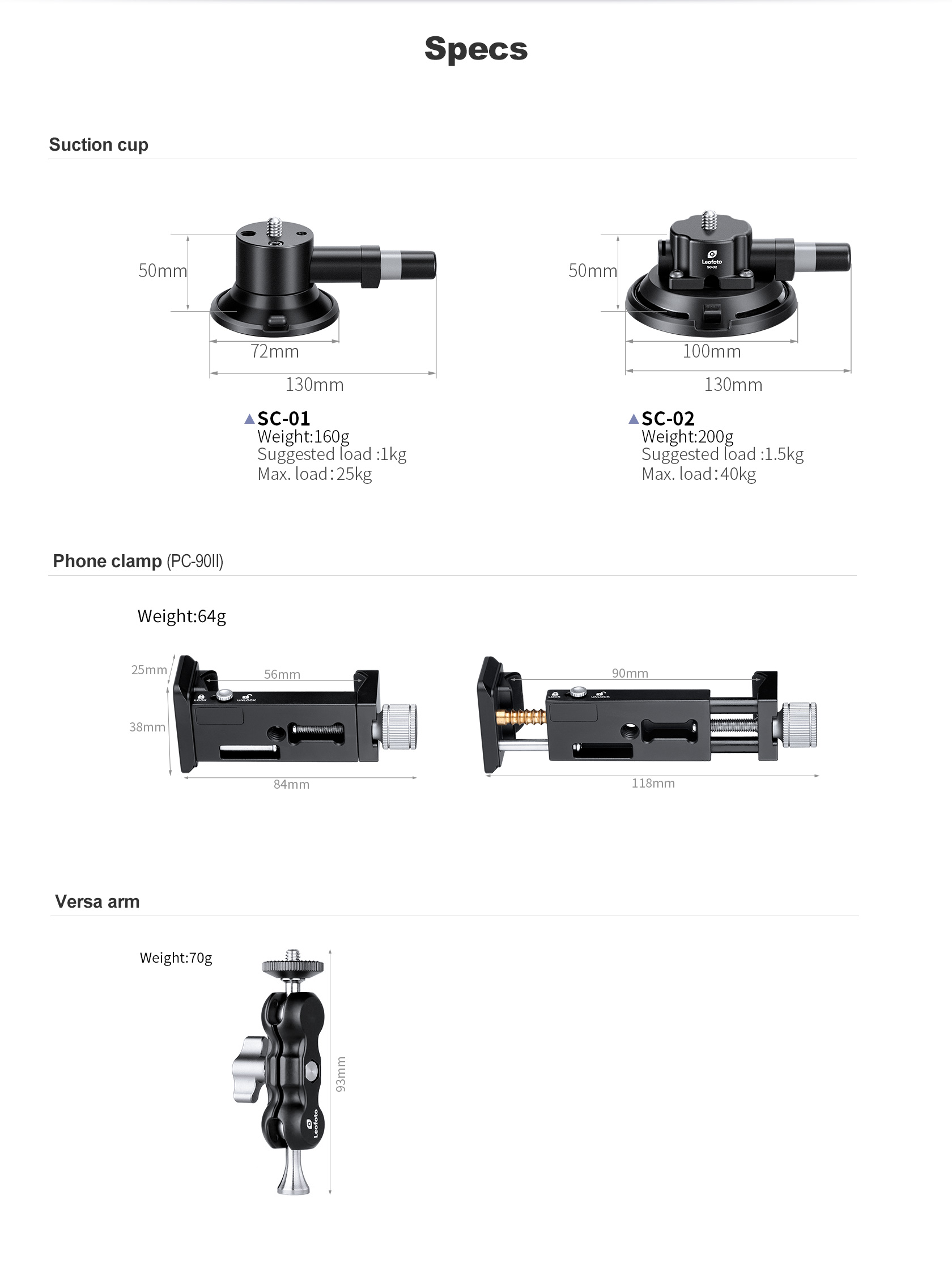 Sản phẩm còn có kích thước nhỏ gọn và trọng lượng nhẹ chỉ 340g, giúp bạn dễ dàng mang theo bên mình khi đi du lịch hoặc quay phim ngoài trời. Suction Cup Leofoto Model SC-02 được trang bị các đường gân chống trượt và một đinh vít 1/4 inch, cho phép bạn kết nối nhanh chóng với nhiều loại thiết bị khác nhau, đáp ứng nhu cầu của bạn trong các tình huống khác nhau.