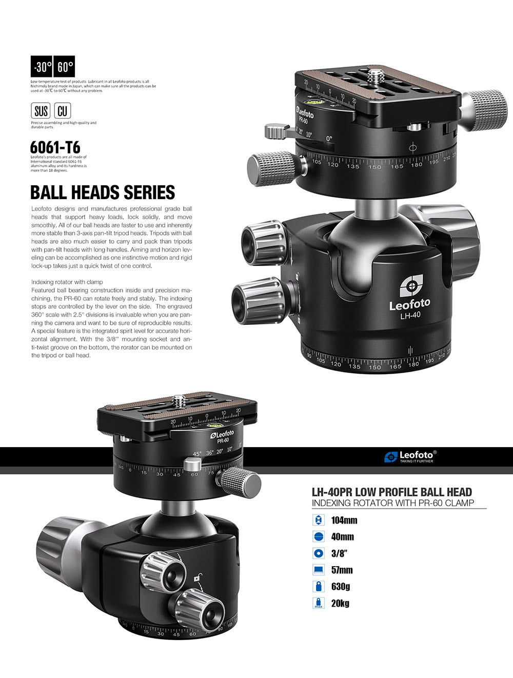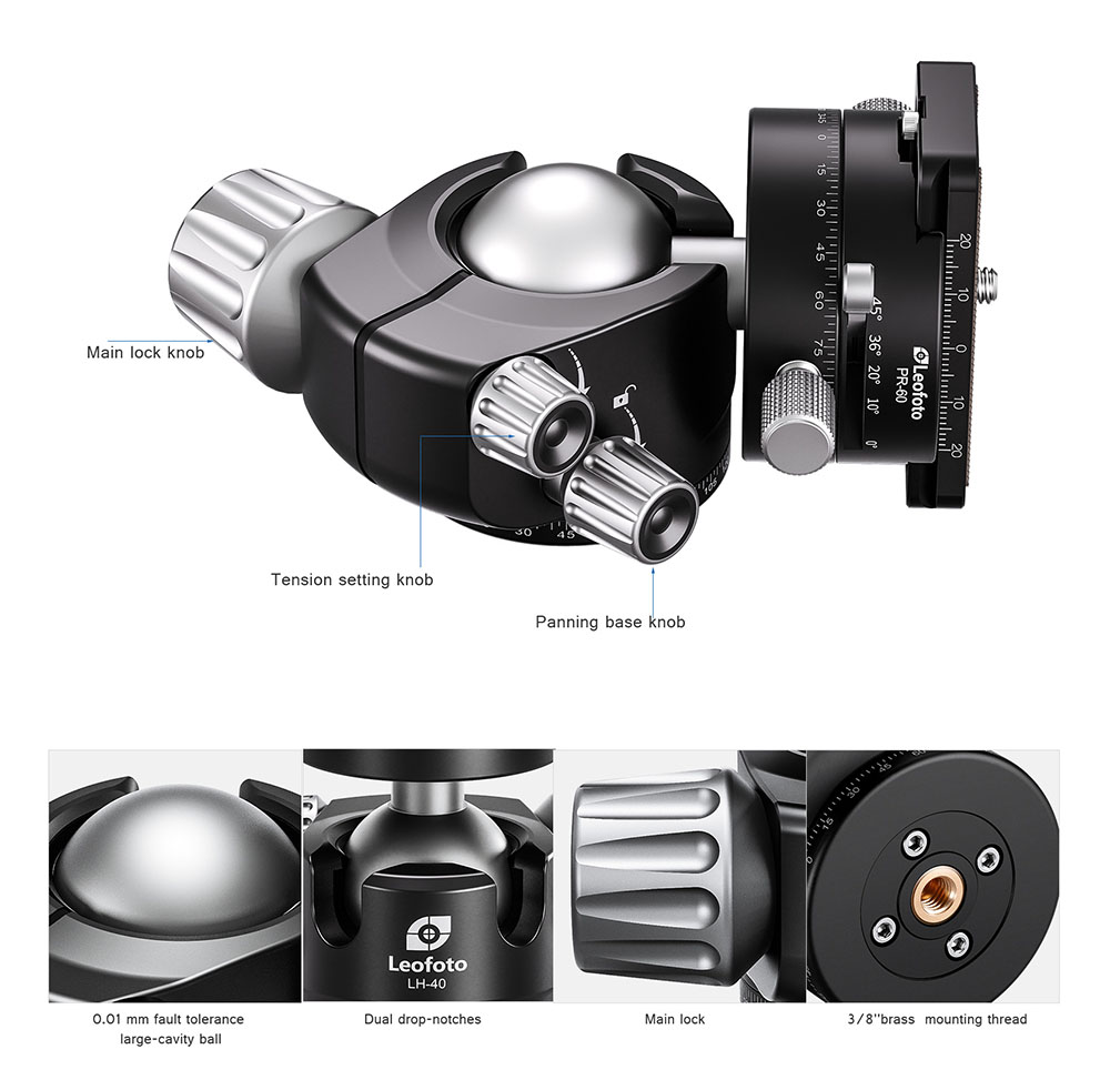 Ngoài ra, với đường kính đáy 57mm và chuẩn ốc UNC 3/8"-16, LH-40PR có thể dễ dàng được gắn vào các loại chân máy khác nhau. Với trọng lượng chỉ khoảng 630g, LH-40PR là một sự lựa chọn tuyệt vời cho những người chuyên nghiệp và tất cả những ai yêu thích chụp ảnh.