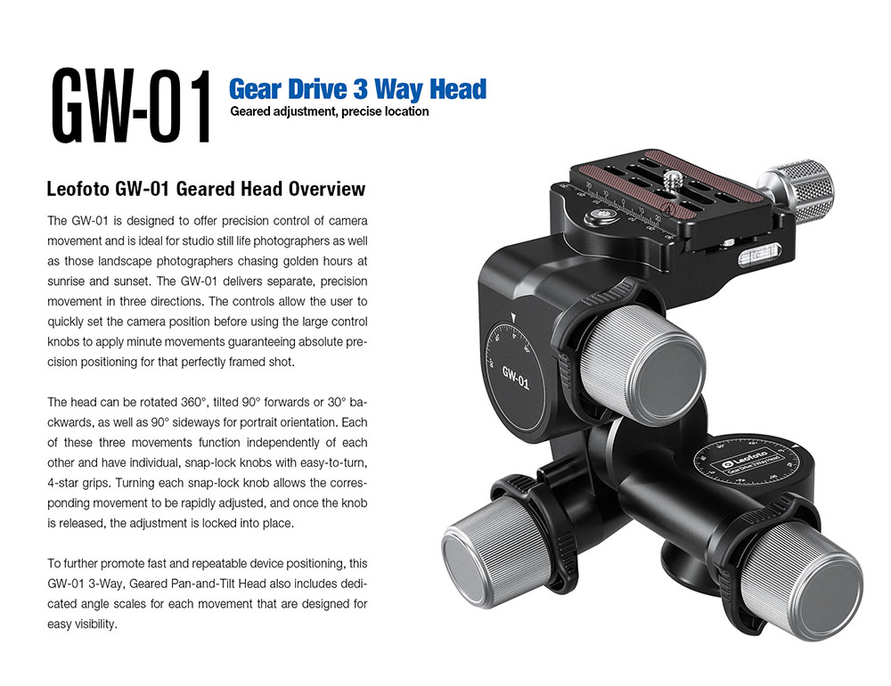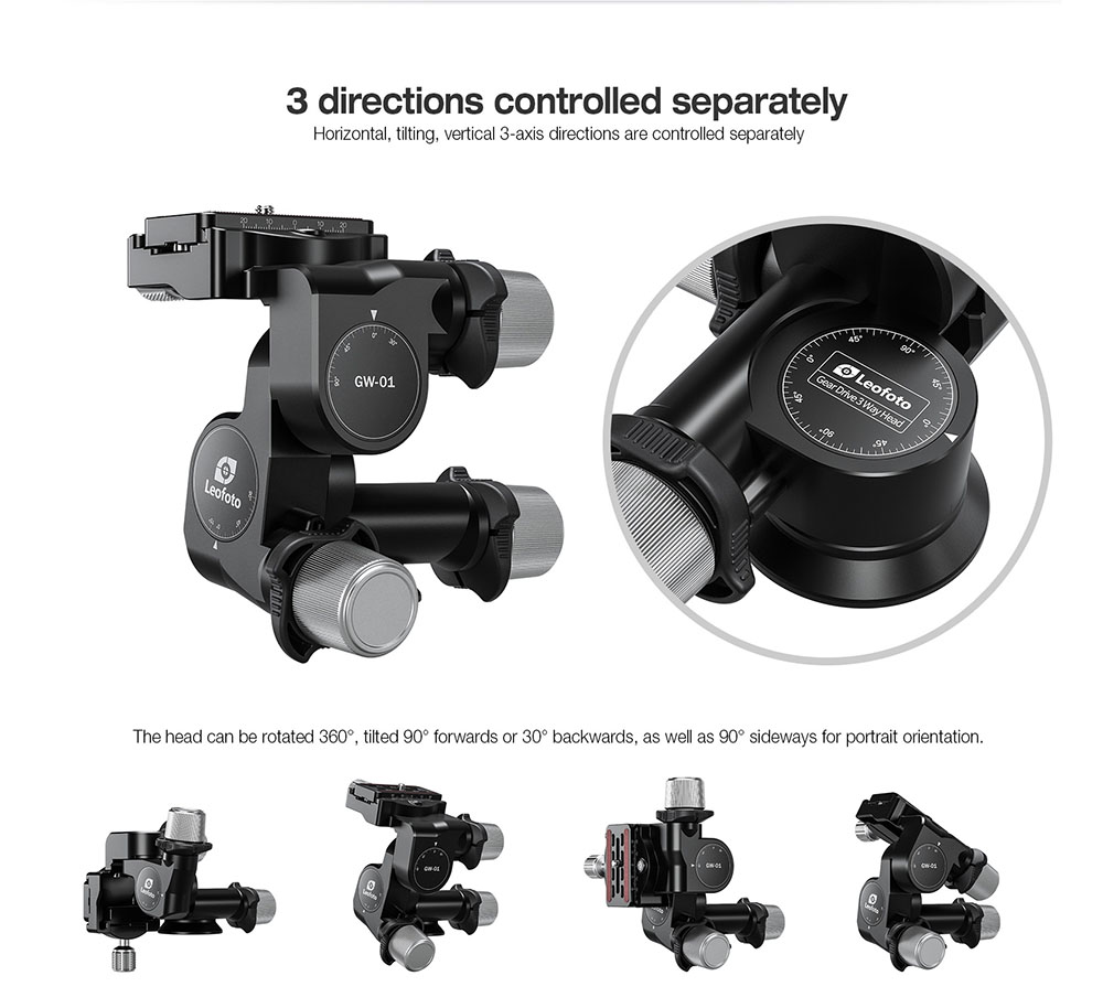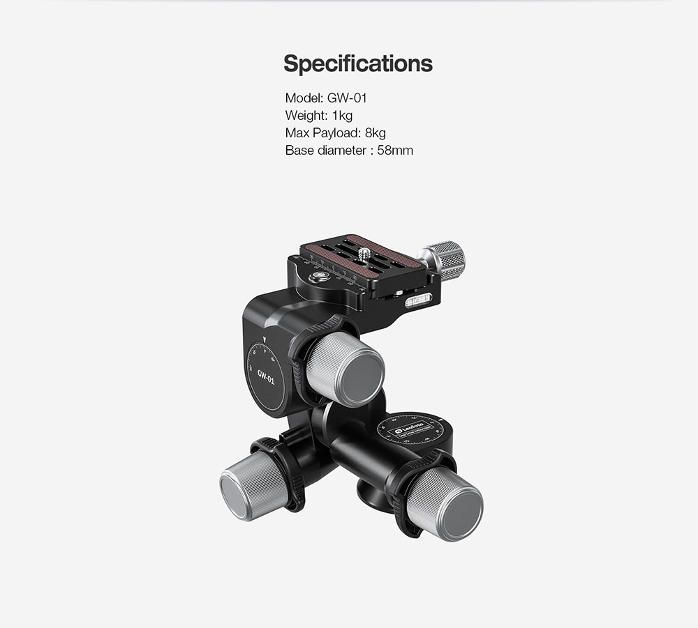 GW-01 được thiết kế để cung cấp chuyển động theo 3 hướng. Đầu bi có thể xoay 360°, nghiêng 90° về phía trước hoặc 30° về phía sau, cũng như xoay dọc 90° về hướng chụp chân dung.