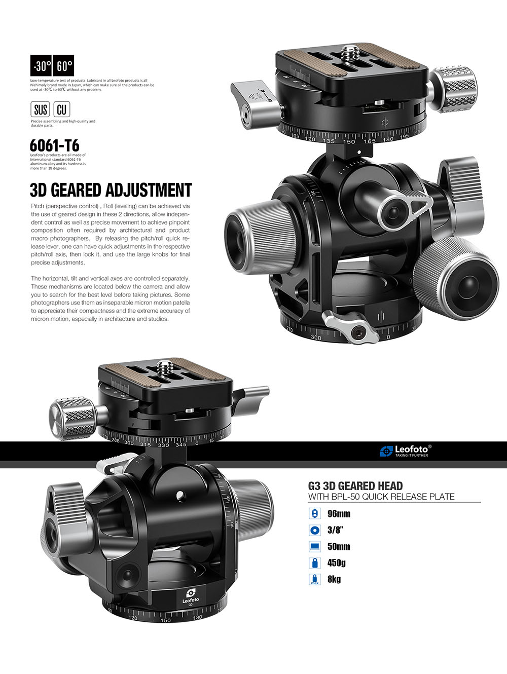 Leofoto G3 là một phụ kiện máy ảnh - đầu quay 3D Geared Head chất lượng cao của hãng Leofoto. G3 không chỉ là một đầu quay thông thường mà còn là một công cụ mạnh mẽ cho nhiếp ảnh kiến trúc và macro. Điều Chỉnh Độc Lập: Trục ngang, nghiêng và dọc, giúp bạn tìm kiếm góc chụp tốt nhất trước khi chụp ảnh. G3 được đánh giá cao bởi sự nhỏ gọn và độ chính xác tuyệt vời, đặc biệt trong lĩnh vực kiến trúc.