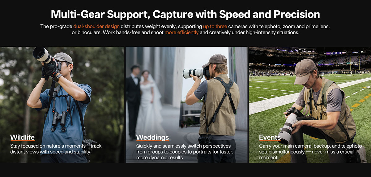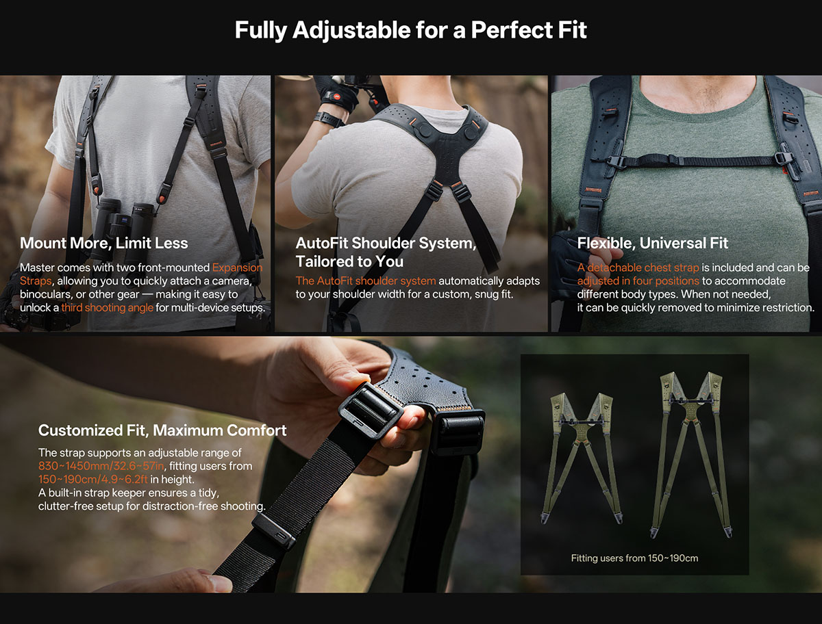 PGYTECH Camera Strap Master Phù hợp cho nhiều bối cảnh: chụp động vật hoang dã, đám cưới, sự kiện… Dây đeo giúp di chuyển linh hoạt, thay đổi góc chụp nhanh chóng, hỗ trợ thao tác chính xác.