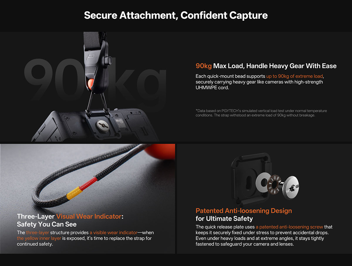 Chịu tải trọng tối đa 90kg, đảm bảo an toàn cho máy ảnh và ống kính nặng. Dây nối ba lớp và thiết kế chống tuột bản quyền giúp tăng cường độ bền.