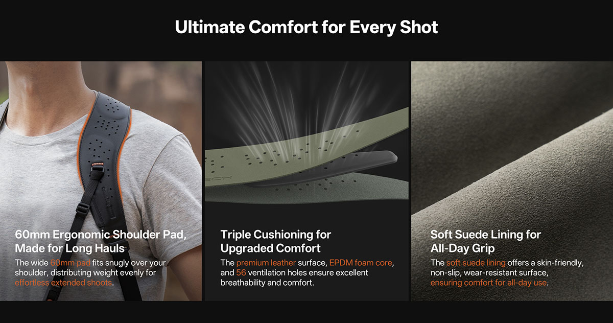 PGYTECH Camera Strap Master có Đệm vai dày với lỗ thoáng khí, bề mặt chống trượt và lớp lót mềm mại, mang lại sự thoải mái cho người dùng trong thời gian dài.