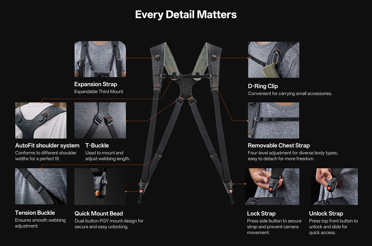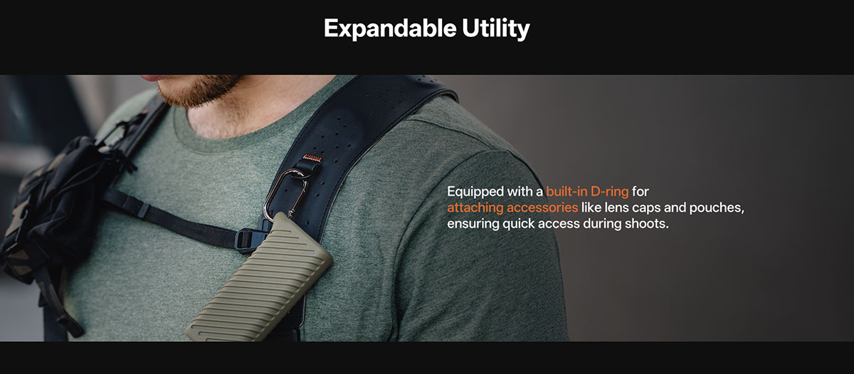 PGYTECH Camera Strap Master Có thể mở rộng với nhiều phụ kiện như túi, kẹp, hoặc các công cụ hỗ trợ, đáp ứng nhu cầu chụp ảnh chuyên nghiệp.