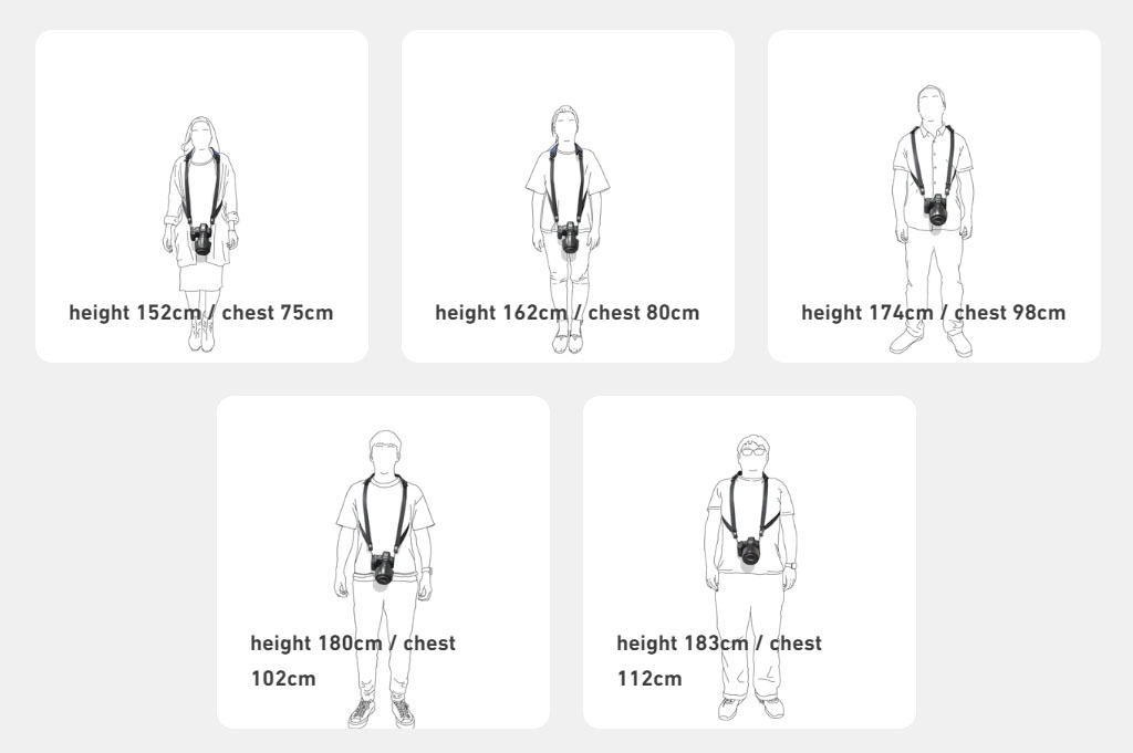 Hình ảnh cho thấy trường hợp dài nhất cho từng loại thể trạng khác nhau. Bạn luôn có thể giữ máy ảnh phía trước ngực của mình.