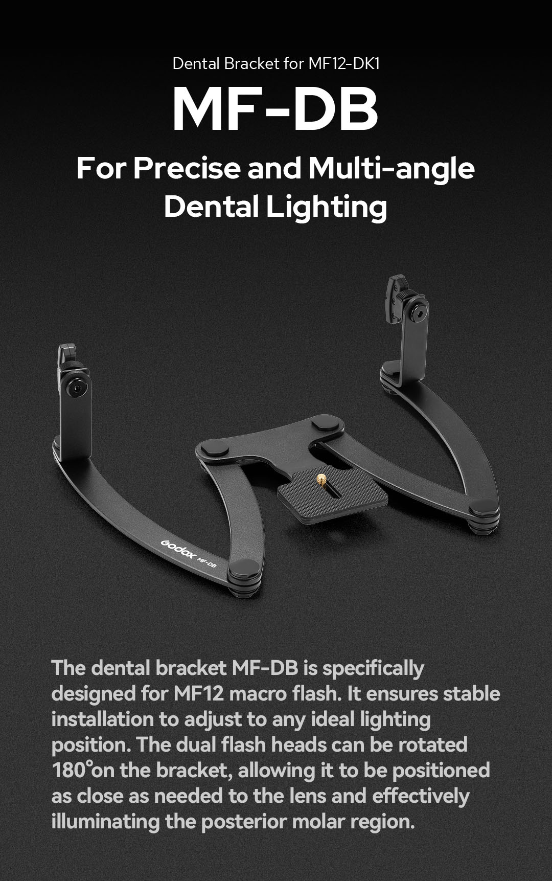 Godox MF-DB là đế đỡ chuyên dụng cho bộ đèn macro MF12, giúp gắn và điều chỉnh đèn linh hoạt trong nhiếp ảnh nha khoa và macro. Thiết kế xoay 180° cho phép đặt đèn sát ống kính, đảm bảo ánh sáng chính xác, đều và hiệu quả, đặc biệt khi chụp vùng răng hàm sau. Khả năng gấp gọn tiện lợi, dễ mang theo và lắp đặt nhanh chóng, phù hợp cho cả phòng khám lẫn tác nghiệp ngoài hiện trường.