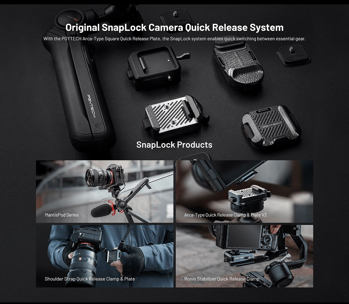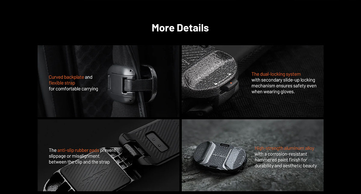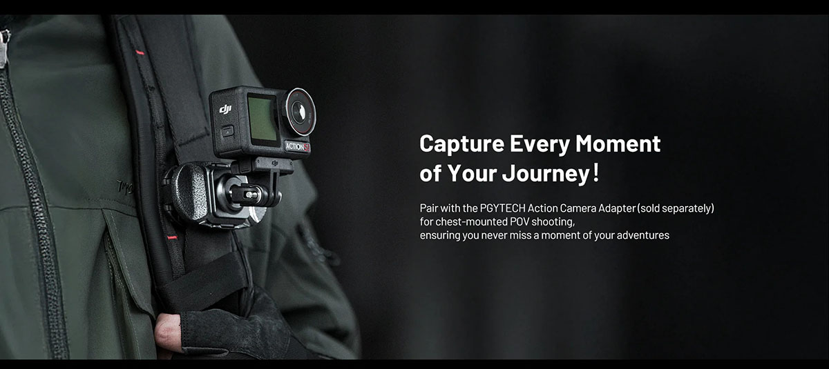 - Hệ thống PGYTECH SnapLock Camera Quick-Release nâng cấp giúp gắn và tháo nhanh chóng, an toàn.