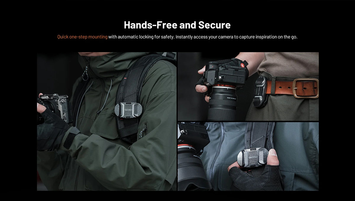 PGYTECH Beetle Camera Clip V2 sử dụng cơ chế SnapLock nâng cấp, giữ máy ảnh chắc chắn ngay cả khi bạn di chuyển nhanh hoặc hoạt động mạnh. Cơ chế này hoạt động mượt mà, không gây kẹt hay khó khăn khi tháo. Điều này đặc biệt hữu ích cho các nhiếp ảnh gia phóng sự, sự kiện hoặc du lịch, khi mỗi khoảnh khắc đều cần được nắm bắt ngay lập tức.