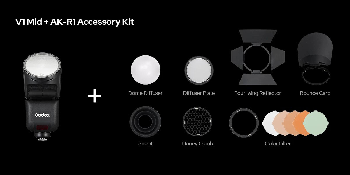 V1 mid hoàn toàn tương thích với Bộ phụ kiện đầu tròn AK-R1, cho phép tạo hình ánh sáng nhanh chóng cho chân dung, sự kiện và các buổi chụp sáng tạo. Khi kết hợp với Gá đèn S3 (S3 Speedlite Bracket), V1 mid cũng hỗ trợ các phụ kiện ngàm Bowens, mở khóa phạm vi công cụ ánh sáng sáng tạo rộng hơn trong khi vẫn duy trì quy trình làm việc gọn nhẹ.