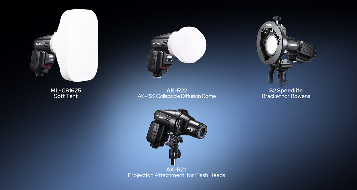 - Tương thích với nhiều phụ kiện Godox như khung gắn speedlite Bowens và bộ phụ kiện AK-R1