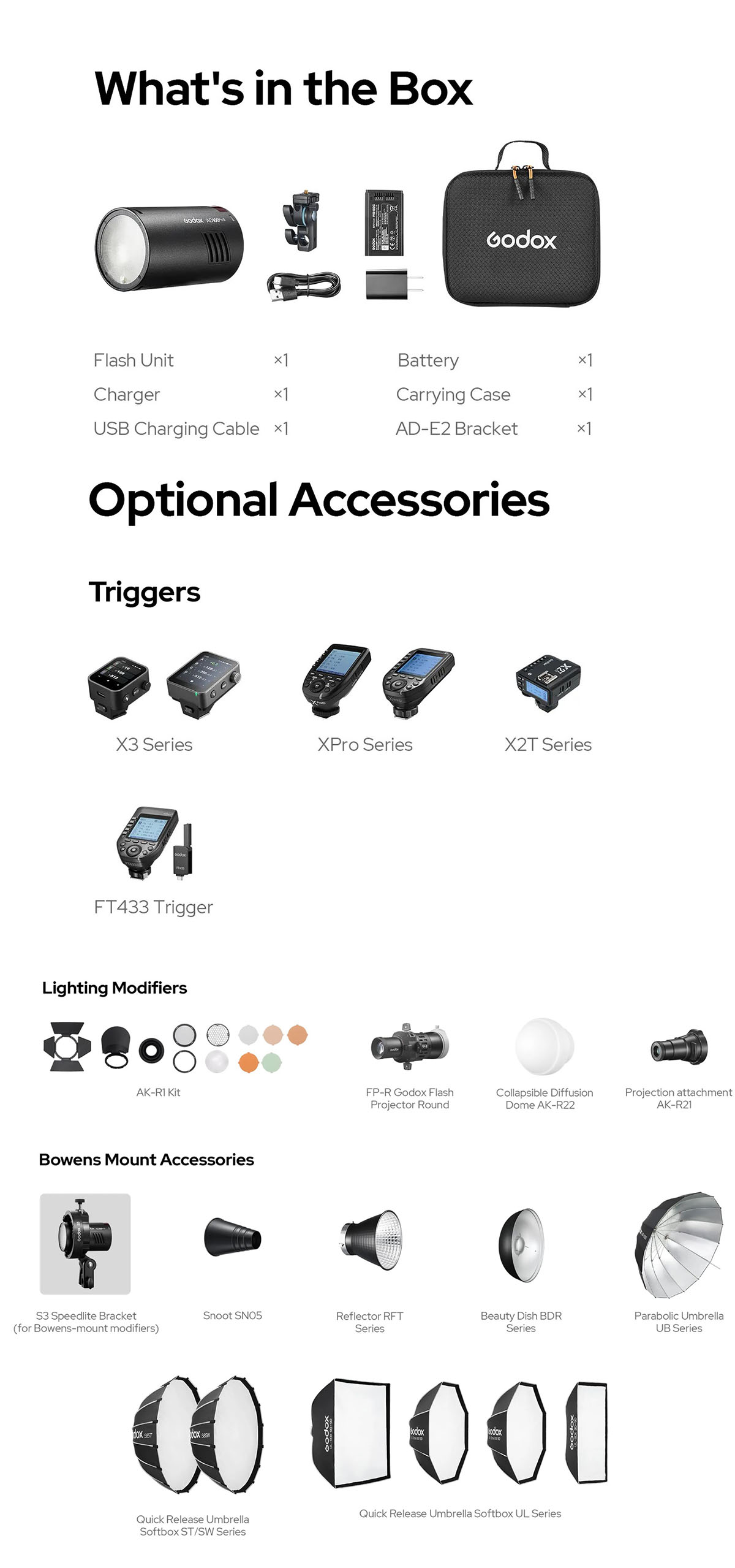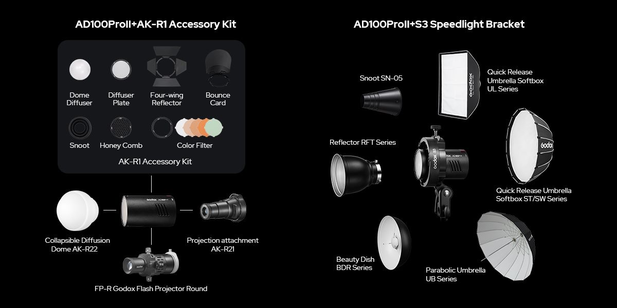 AD100Pro II có ngàm nam châm tích hợp hoạt động mượt mà với các phụ kiện đầu tròn của Godox, bao gồm bộ kit AK-R1, Tản sáng vòm gập AK-R22, và Đầu tạo hình AK-R21, cho phép các tùy chọn tạo hình ánh sáng nhanh chóng và đa dạng. Với adapter S3, nó cũng hỗ trợ các phụ kiện ngàm Bowens như softbox UL và chóa BDR, mang lại sự linh hoạt sáng tạo rộng lớn cho cả ánh sáng studio và ngoại cảnh.