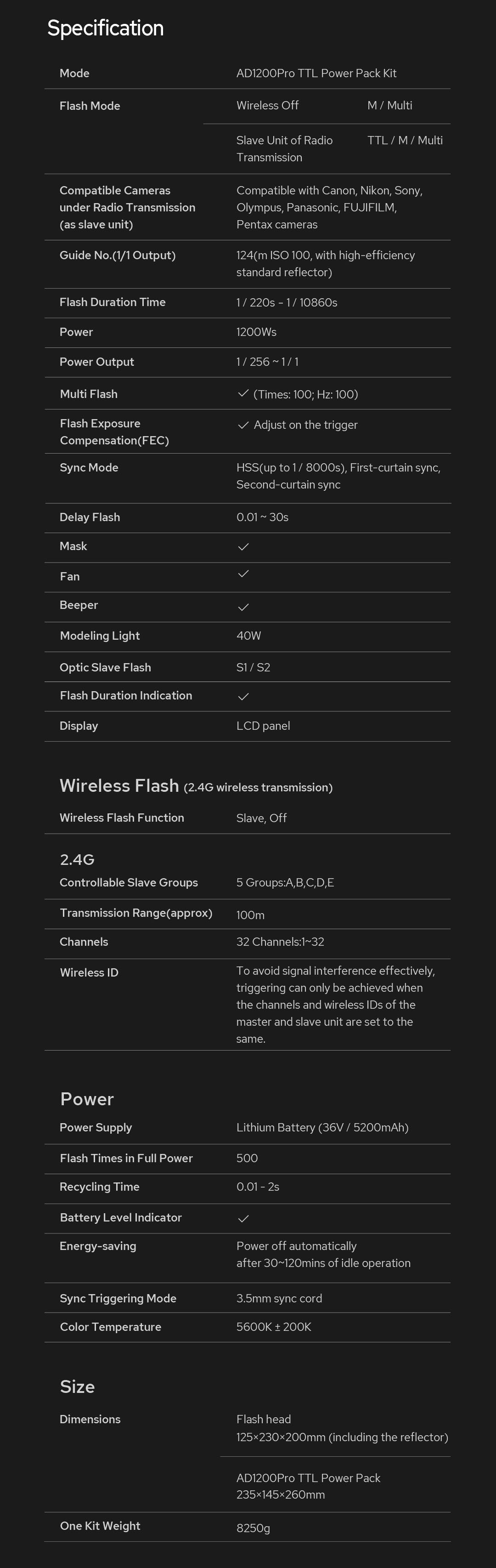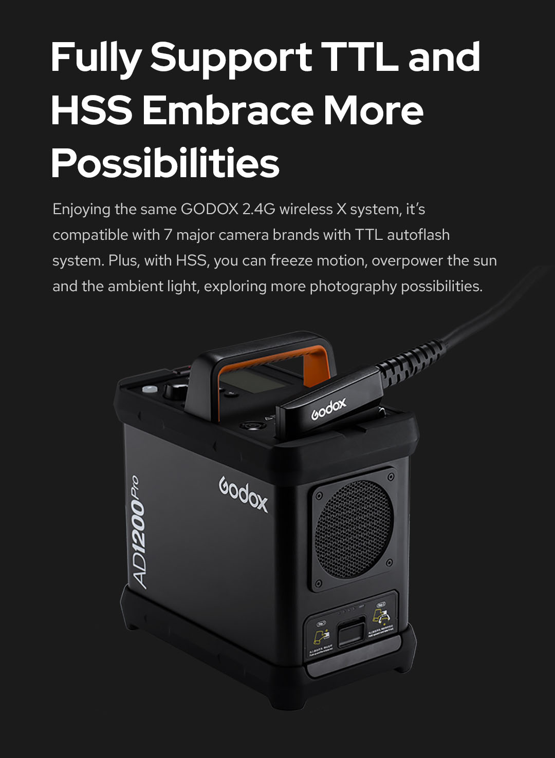 Tương tự với các sản phẩm đèn flash khác của Godox, Godox AD1200 Pro cũng hỗ trợ hệ thống điều khiển không dây X 2.4G. Thiết bị hiện nay tương thích với 7 thương hiệu máy ảnh hiện nay thông qua hệ thống TTL autoflash. Thêm vào đó, với sự hỗ trợ của HSS, người dùng có thể theo dõi các chuyển động rõ ràng, hòa trộn tốt với môi trường ánh sáng khi thực hiện các buổi chụp hình.