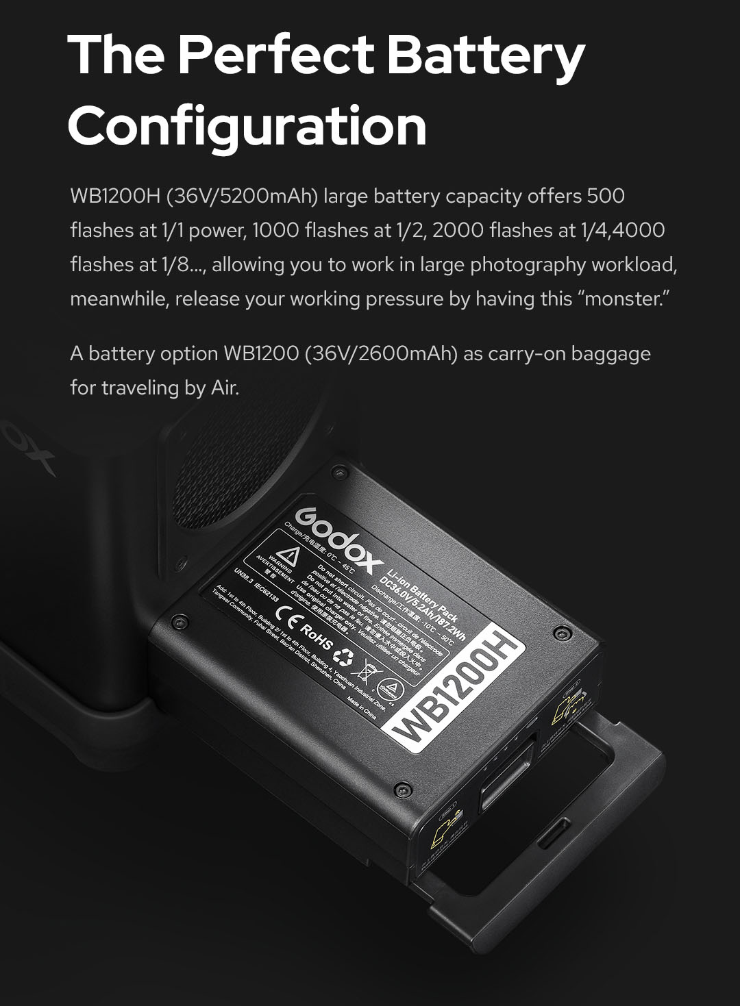 Sử dụng loại pin WB1200H cung cấp dung lượng pin 5600mAh/36V. Nó cho phép thực hiện tối đa 500 lần nháy sáng với công suất toàn phần và hàng nghìn lần đánh sáng khác ở các công suất thấp hơn sau mỗi lần sạc.