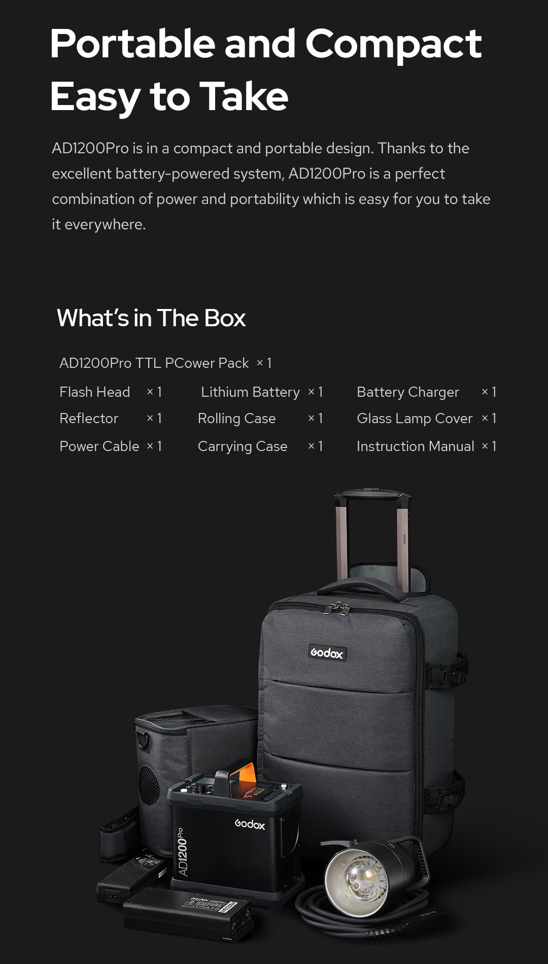 Godox AD1200 Pro hỗ trợ các nhiếp ảnh gia sử dụng tự do khi thực hiện các buổi chụp hình trong studio hoặc ngoài trời. Với công suất lớn 1200Ws, hệ thống điều khiển không dây hiện đại tương thích với đa số các nhãn hiệu máy ảnh trên thị trường, thiết bị có thể cung cấp đủ năng lượng để hoàn thành các bức hình hoàn hảo cho bạn.