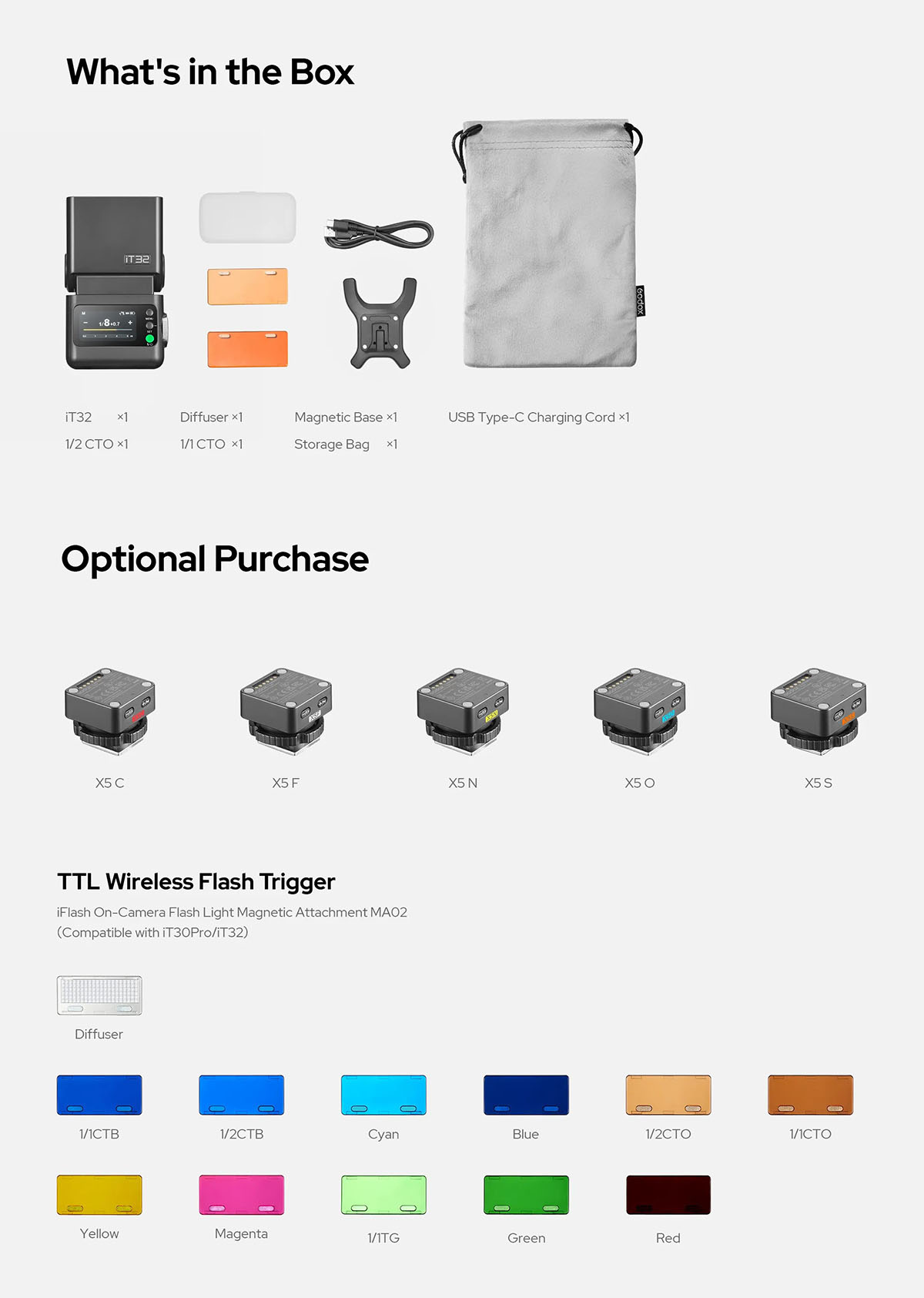 Godox iT32 + X5 là bộ đèn bao gồm đèn flash iT32 và trigger không dây X5 TTL - một hệ thống chiếu sáng mô-đun được xây dựng để mang lại sự linh hoạt và hiệu quả tối đa. Khi kết hợp với các phiên bản X5 khác nhau, một thân đèn iT32 có thể thích ứng liền mạch với các máy ảnh Canon, Nikon, Sony, Fujifilm và Olympus, hỗ trợ đầy đủ các tính năng TTL và HSS (đồng bộ tốc độ cao) trên nhiều thương hiệu.
