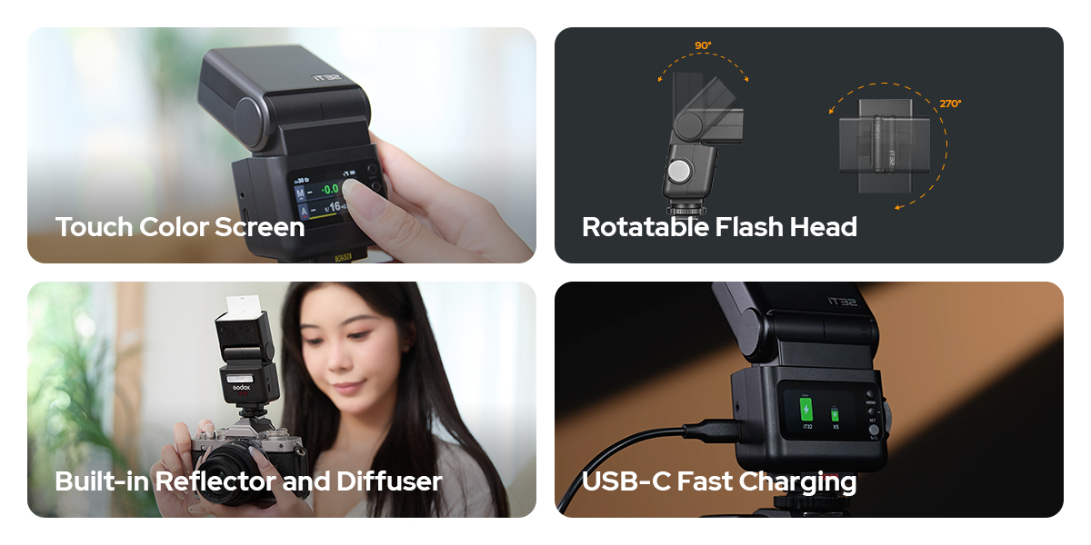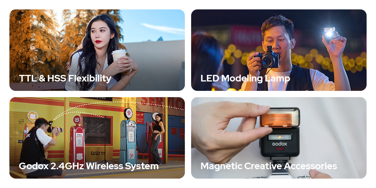 Bao gồm: Chức năng đèn flash nâng cao, Hệ sinh thái không dây Godox 2.4GHz, Phụ kiện từ tính để mở rộng khả năng sáng tạo, Đèn LED Modeling