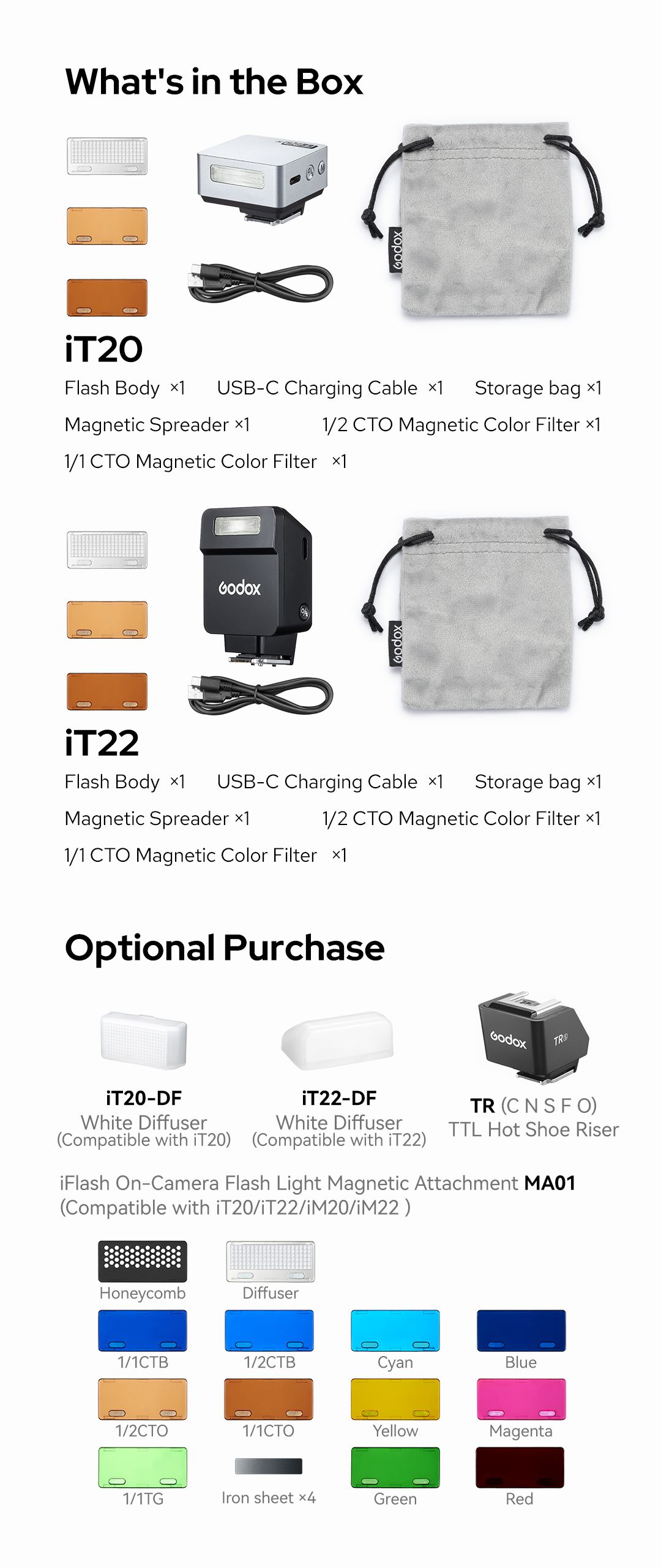 Giới thiệu Đèn Flash Máy ảnh iT20/iT22 iFlash. Thân máy cực kỳ nhỏ gọn chỉ 45g với chức năng TTL, hoàn hảo cho cả việc sử dụng trong nhà và ngoài trời, dễ dàng bỏ vừa túi áo của bạn để sáng tạo bất cứ lúc nào. Các phụ kiện nam châm đổi mới giúp chuyển đổi hiệu ứng ánh sáng nhanh chóng, tạo ra bầu không khí độc đáo và các khả năng sáng tạo không giới hạn.