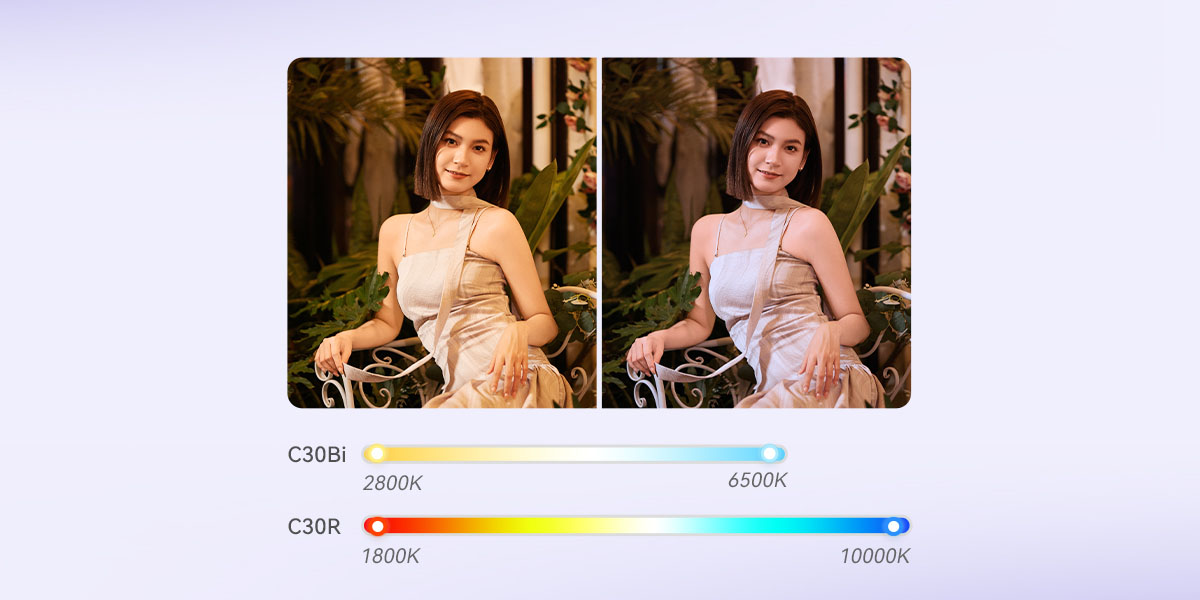 Phiên bản C30Bi cho phép bạn điều chỉnh nhiệt độ màu từ 2800K đến 6500K, trong khi phiên bản C30R tiến xa hơn với dải màu ấn tượng từ 1800K đến 10000K hoàn hảo cho mọi nhu cầu sáng tạo.
