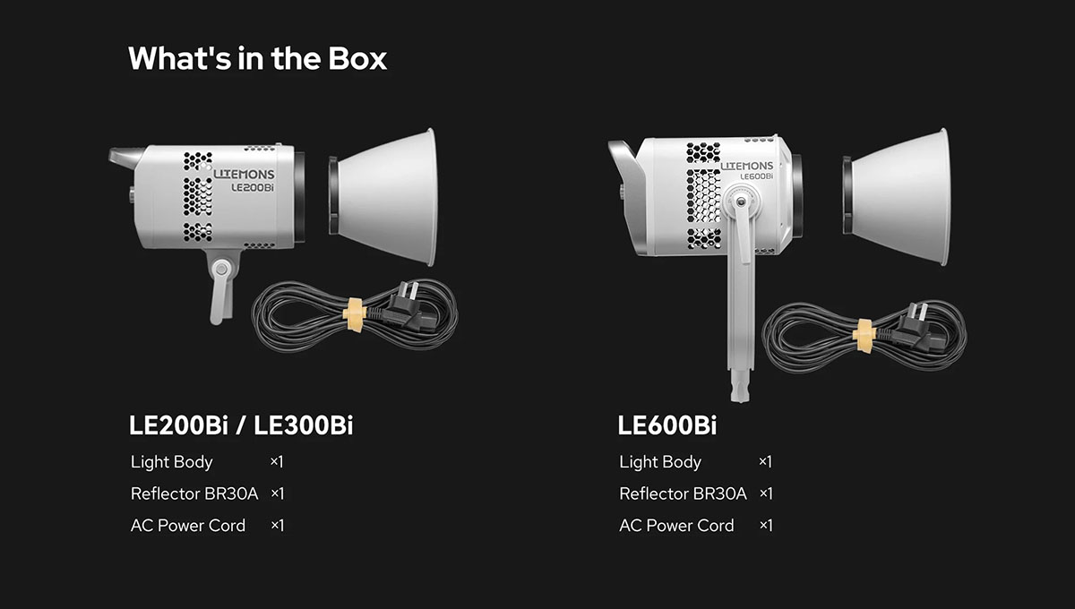 Được thiết kế với bộ nguồn tích hợp sẵn bên trong thân đèn, LE600Bi không cần đến adapter (cục nguồn) rời bên ngoài. Điều này mang lại một thiết kế tinh gọn, dễ dàng di chuyển, thiết lập nhanh chóng hơn và giúp không gian quay chụp gọn gàng hơn.