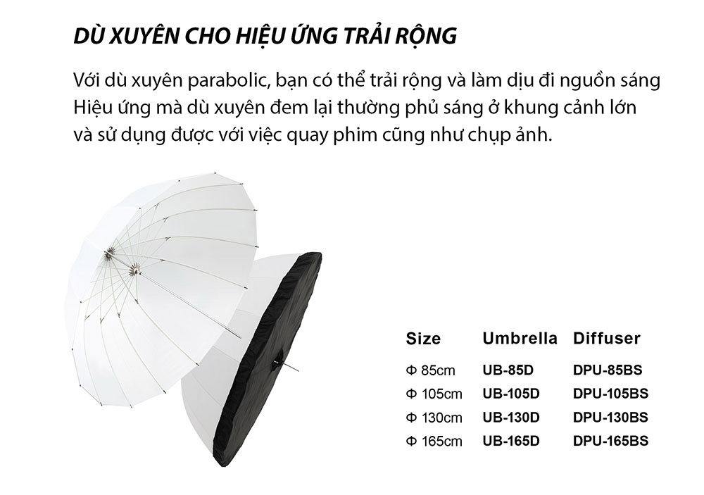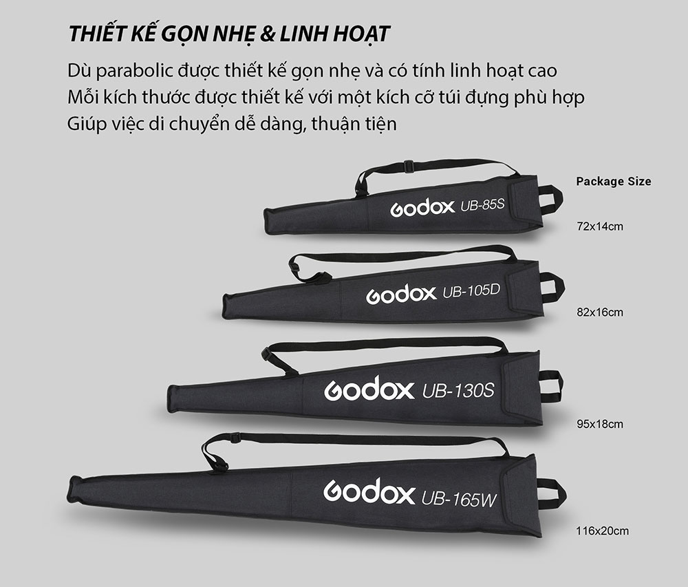 Hoằng Quân - nhà phân phối Dù Parabolic Godox - UB-85, UB-105, UB-130, UB-165 chính hãng tại Việt Nam. Các sản phẩm có mặt tại khắp các đại lý trên toàn quốc. Quý khách có thể yên tâm đặt hàng tại website: hoangquanco.com miễn phí giao hàng toàn quốc. Ngoài ra, Showroom Hoằng Quân có mặt tại TPHCM, Hà Nội, Đà Nẵng để quý khách có thể đến trải nghiệm sản phẩm tốt nhất!