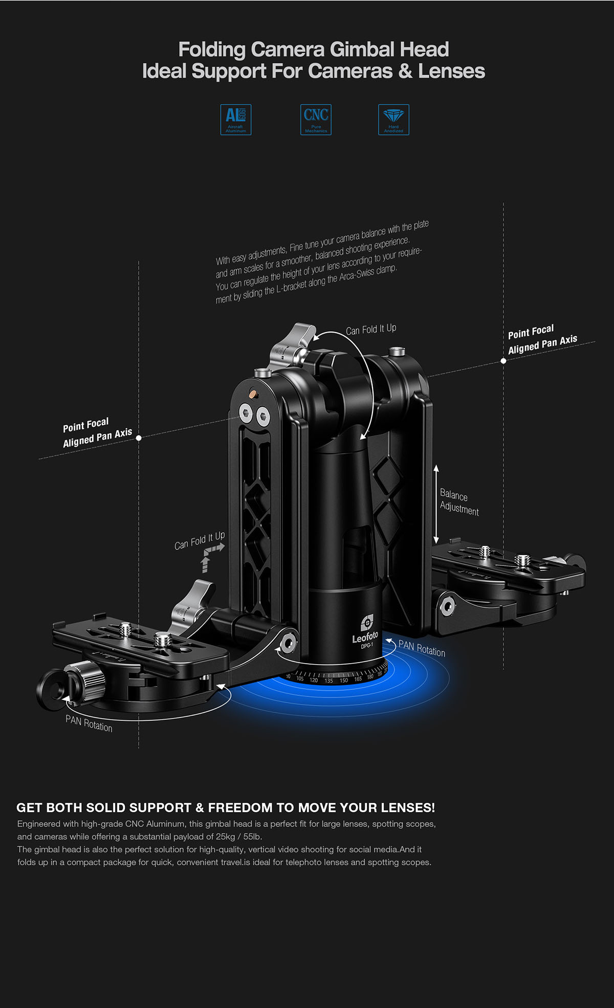 Leofoto DPG-1 là đầu gimbal Dual-camera - giải pháp chuyên nghiệp dành cho các nhiếp ảnh gia và nhà làm phim cần gắn đồng thời hai máy ảnh trong một hệ thống ổn định và linh hoạt. Được chế tạo từ hợp kim nhôm cao cấp với cấu tạo bền bỉ, sản phẩm cho phép điều chỉnh trục Pan, Tilt và Roll một cách mượt mà và chính xác, giúp cân bằng tải tối ưu cho các dự án quay phim phức tạp. Hệ thống gắn kép cùng cơ chế khóa an toàn của DPG-1 giúp tiết kiệm thời gian chuyển đổi góc quay và hỗ trợ quay đa camera trong mọi điều kiện, mang lại hiệu suất cao và sự linh hoạt tối đa cho các cảnh quay sáng tạo.