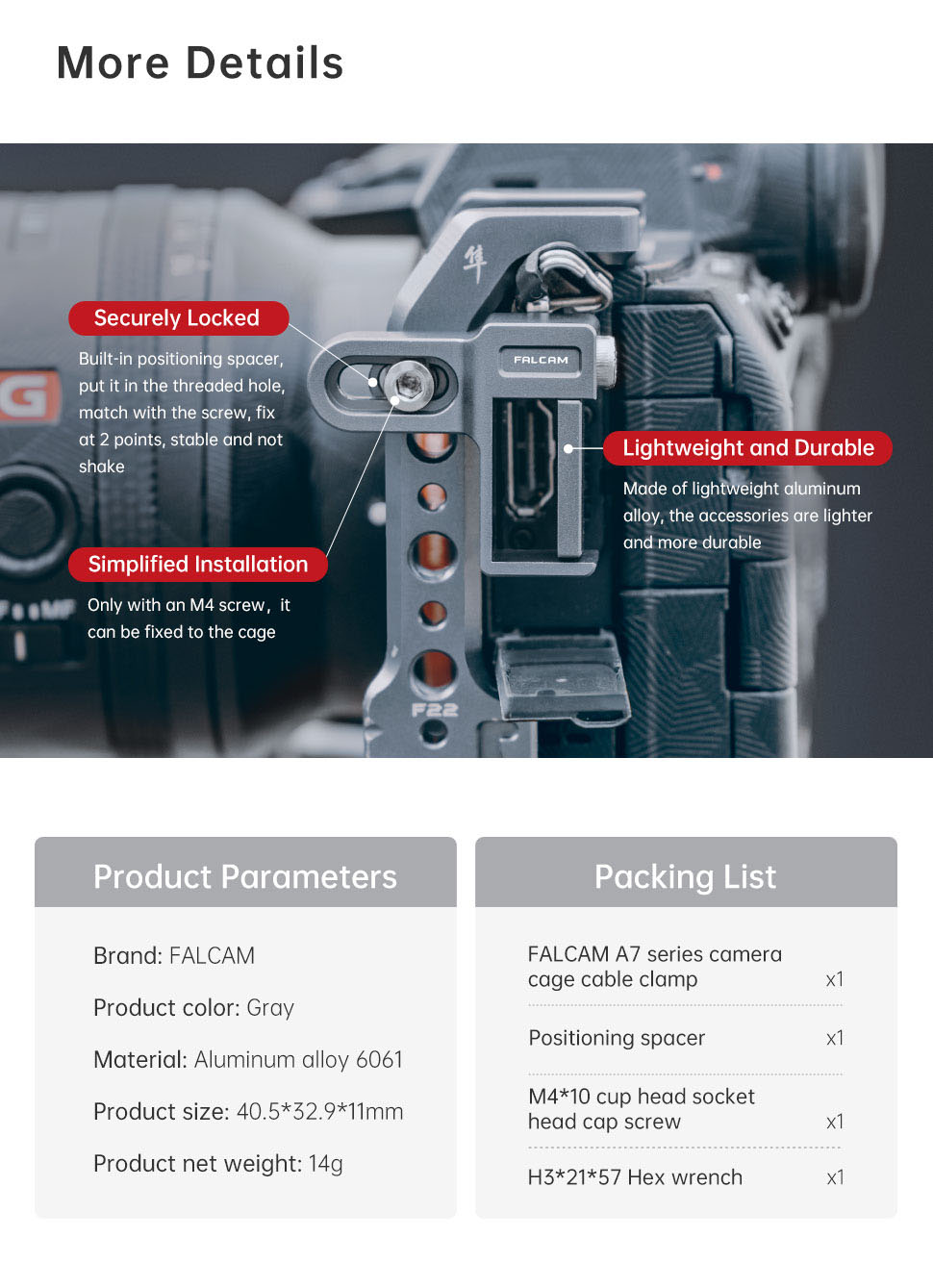 Hoằng Quân - nhà phân phối Falcam F22 Camera Quick Release Cable Clamp (FOR SONY A7 Series) - 2977 chính hãng tại Việt Nam. Các sản phẩm có mặt tại khắp các đại lý trên toàn quốc. Quý khách có thể yên tâm đặt hàng tại website: hoangquanco.com miễn phí giao hàng toàn quốc. Ngoài ra, Showroom Hoằng Quân có mặt tại TPHCM, Hà Nội, Đà Nẵng để quý khách có thể đến trải nghiệm sản phẩm tốt nhất!