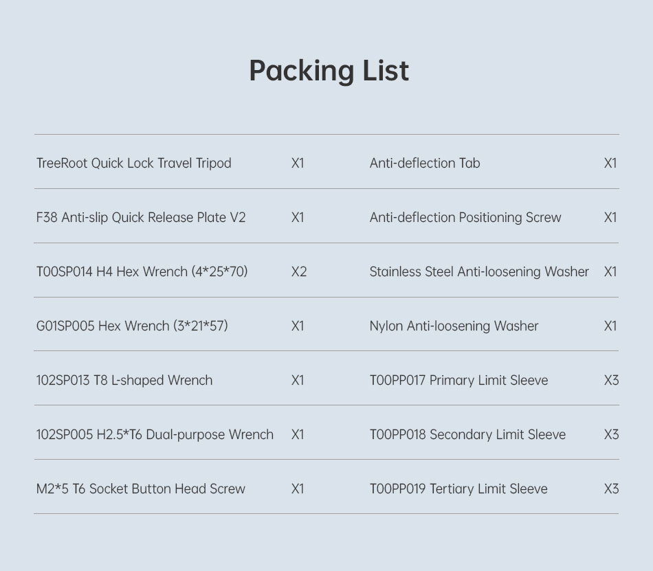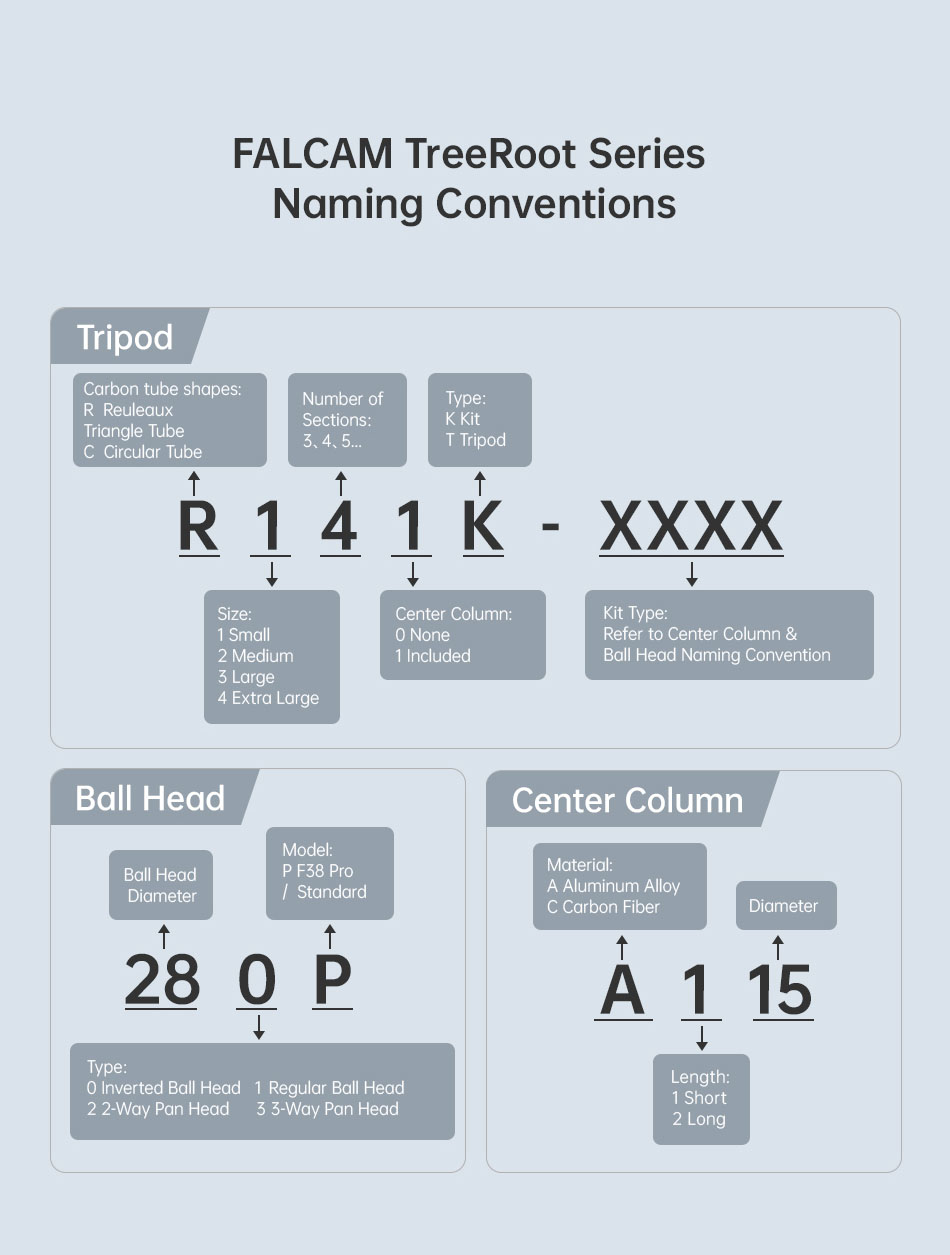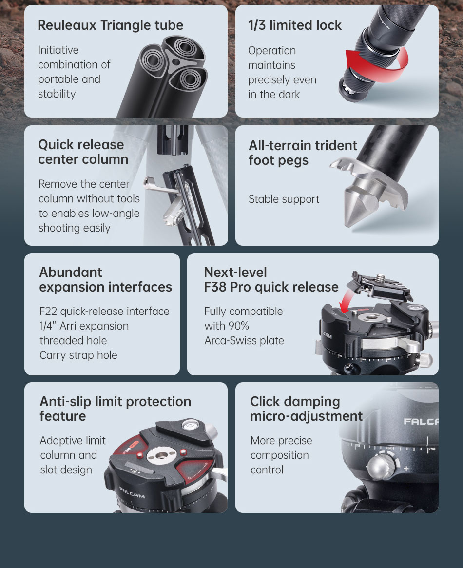 FALCAM TreeRoot Quick Lock Travel Tripod có khả năng tải trọng ấn tượng với 50 kg khi các ống chân cố định, 10-20 kg khi sử dụng trụ giữa và 5 kg khi sử dụng ballhead. Đường kính các ống chân lần lượt là 26 x 40.75mm, Φ22 mm, Φ17.9 mm, và Φ13.8 mm, cùng với đường kính ballhead là Φ32 mm, đảm bảo sự ổn định và chắc chắn trong mọi tình huống chụp ảnh. Đây chính là người bạn đồng hành đáng tin cậy cho mọi nhiếp ảnh gia, từ những chuyến phiêu lưu ngoài trời đến các buổi chụp chuyên nghiệp trong studio.