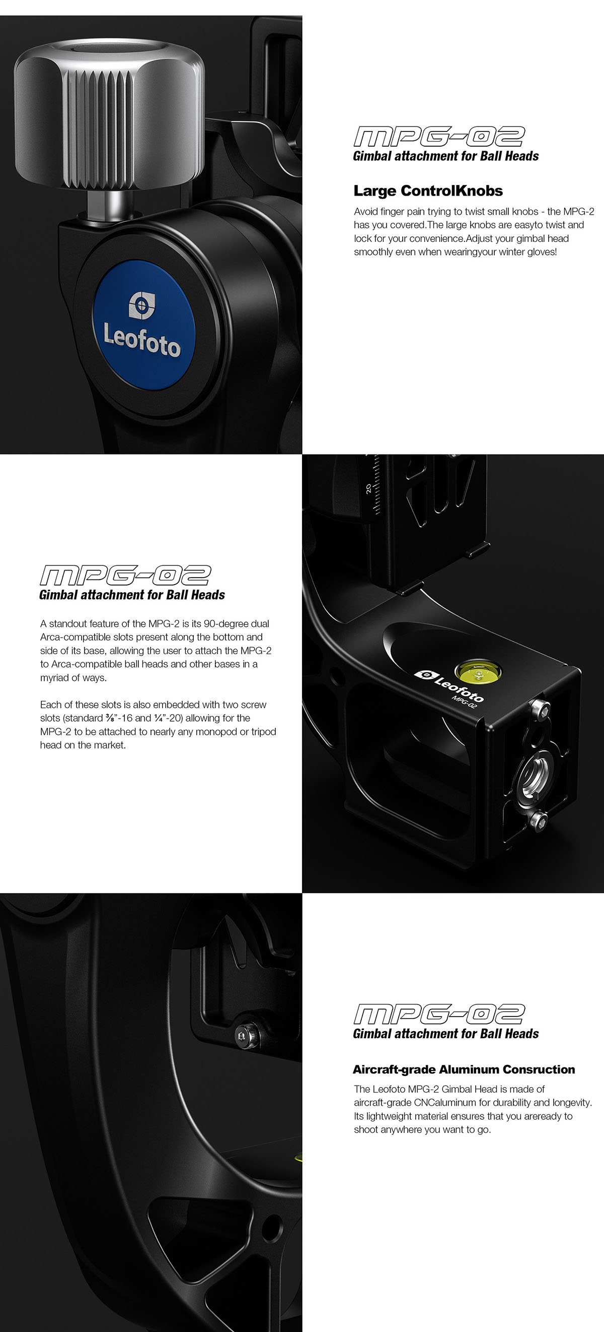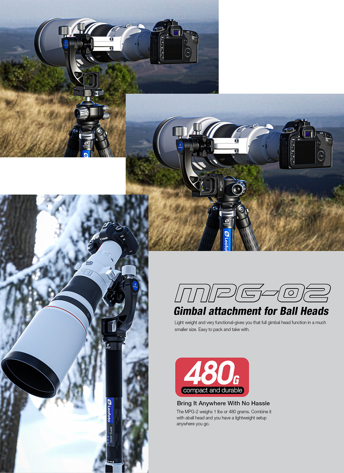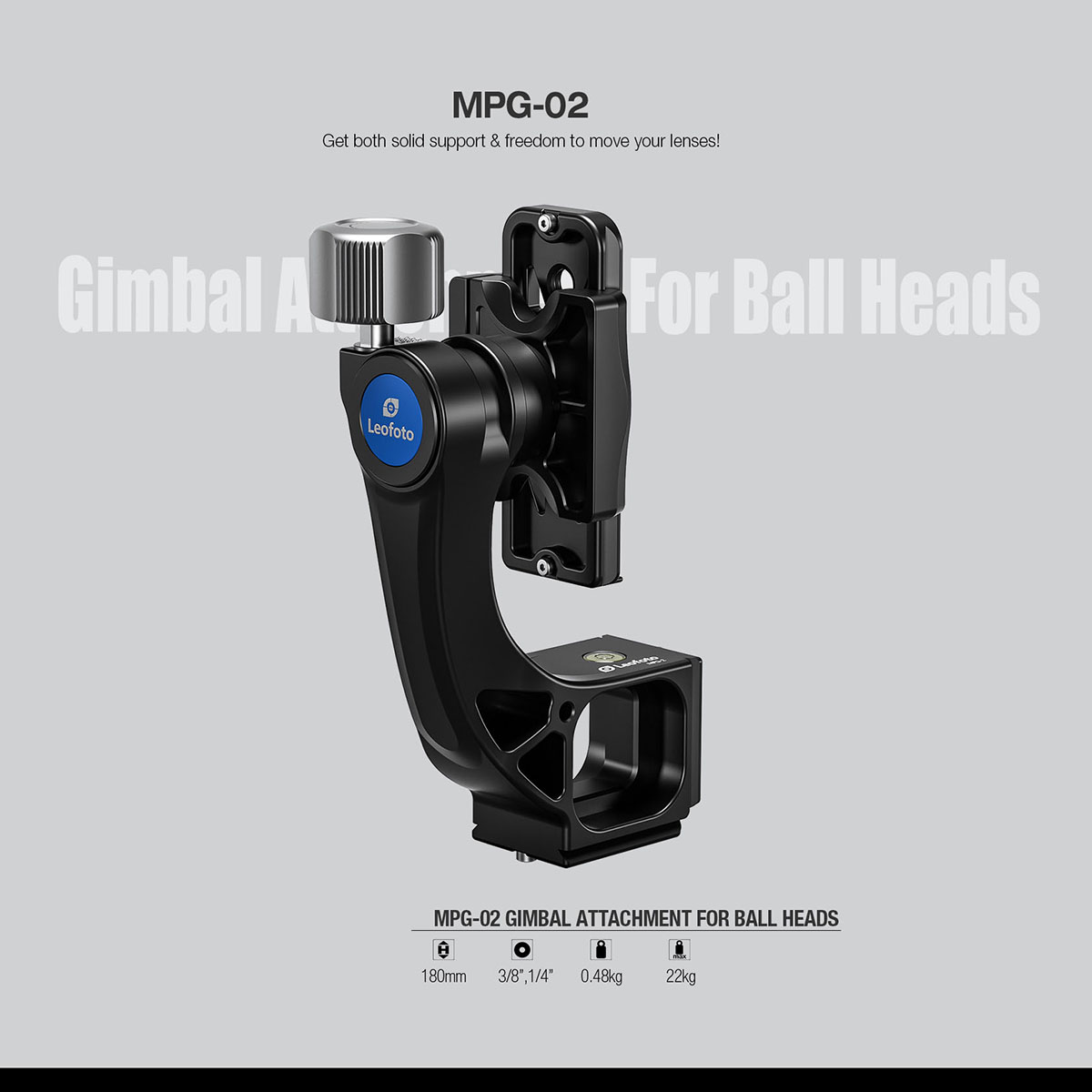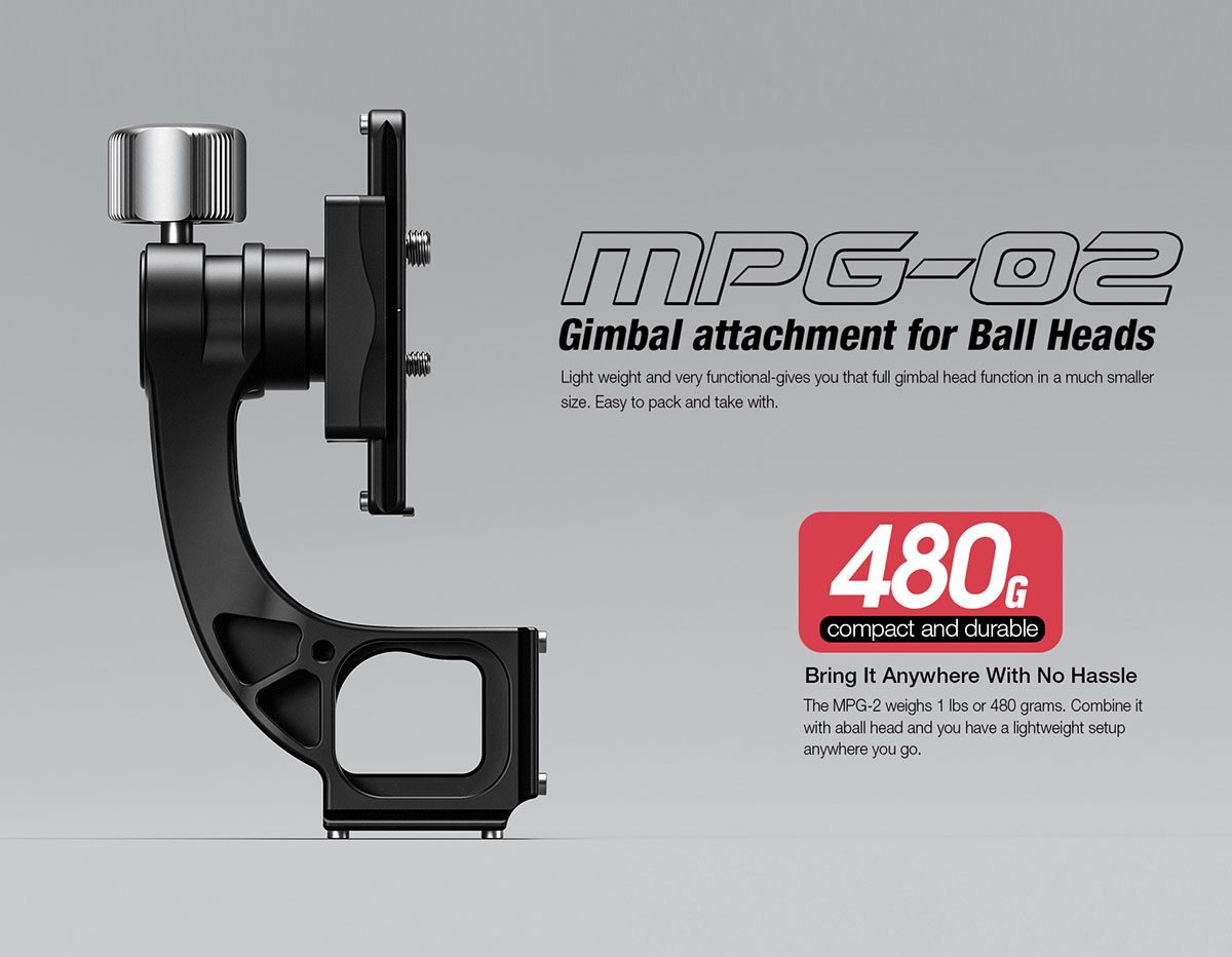 Leofoto MPG-02 là phụ kiện Gimbal gắn cho đầu bi, cung cấp cho bạn chức năng đầu gimbal đầy đủ trong kích thước nhỏ hơn. Leofoto MPG-02 có trọng lượng 480g nhưng tải trọng lên đến 22kg. Kết hợp với đầu bi và bạn sẽ có một thiết bị gọn nhẹ ở bất cứ đâu.