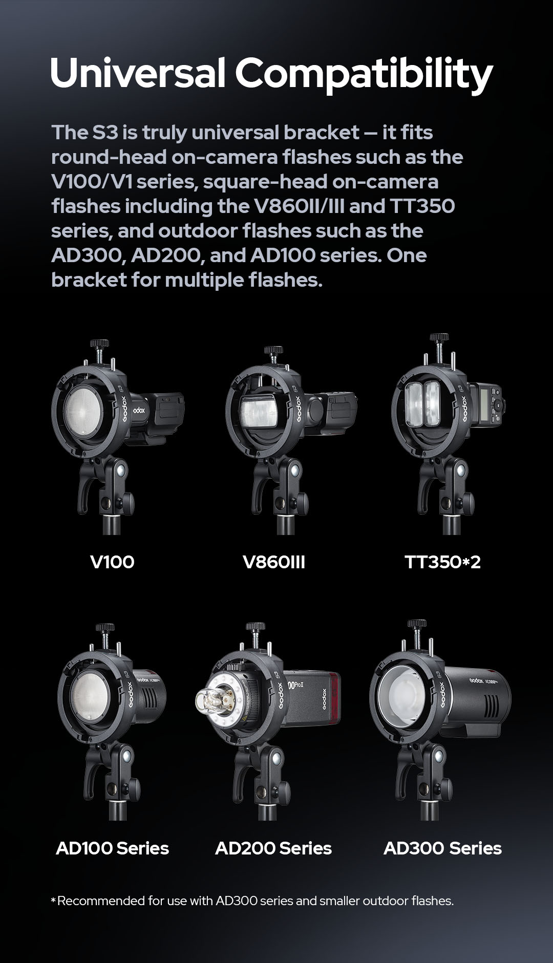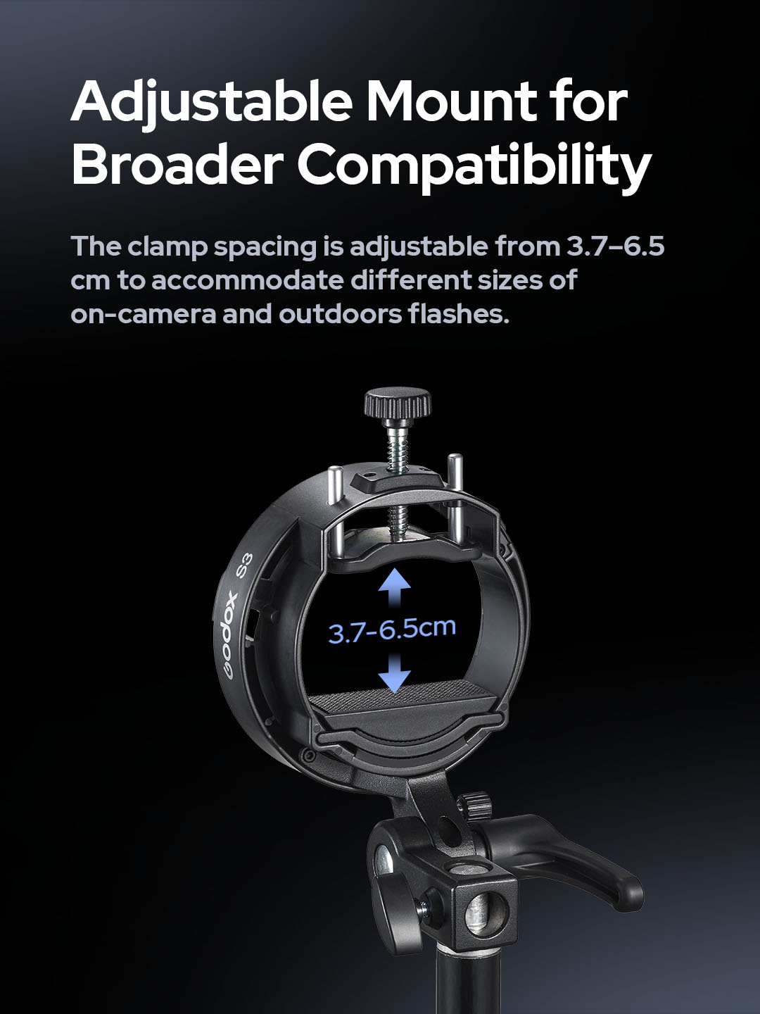Godox S3 là đế đỡ đèn flash mới nhất được thiết kế để thay thế hoàn toàn các phiên bản tiền nhiệm S1 và S2, mang đến giải pháp kết nối ánh sáng "All-in-One" nhỏ gọn và chính xác hơn. Điểm mạnh nhất của S3 là khả năng tương thích đa dạng tuyệt đối: từ đèn Speedlite đầu vuông truyền thống, đèn đầu tròn (như Godox V1/V1Pro), cho đến các dòng đèn ngoại cảnh chuyên dụng như AD100Pro, AD200Pro, AD300Pro và AD400Pro. Thiết bị cho phép các nguồn sáng nhỏ gọn này sử dụng được toàn bộ hệ sinh thái phụ kiện ngàm Bowens chuyên nghiệp (softbox, chóa, beauty dish).