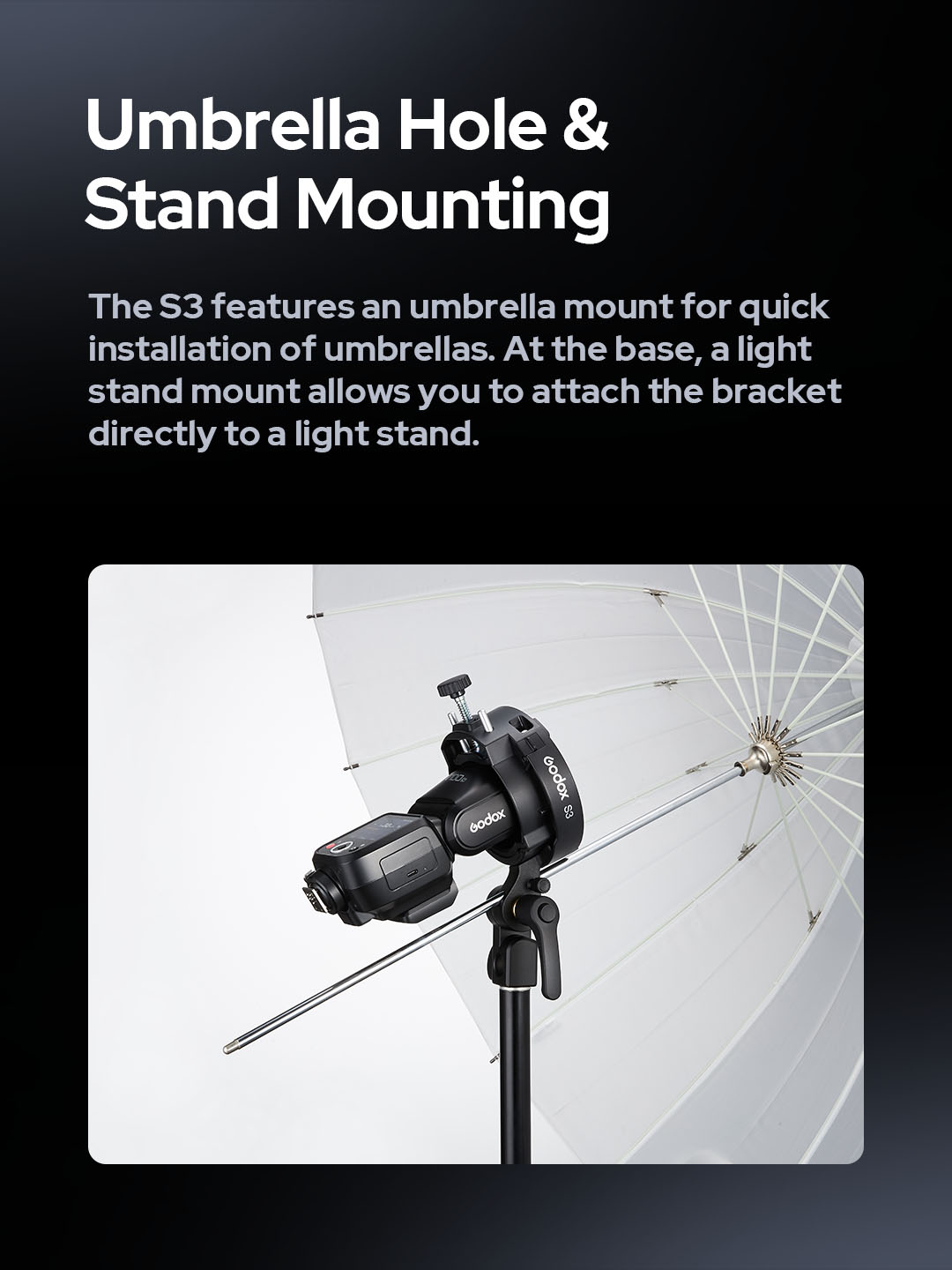 So với bản S2, Godox S3 được tinh chỉnh đáng kể về thiết kế khí động học: kích thước nhỏ hơn giúp tiết kiệm diện tích balo, trọng lượng nhẹ hơn nhưng kết cấu lại chắc chắn hơn. Cơ chế gập (tilt) được nâng cấp để điều chỉnh góc chiếu linh hoạt và mượt mà, khắc phục tình trạng cấn vướng khi gập sâu của đời cũ. Bên cạnh đó, hệ thống khóa dù bằng ốc vặn mới đảm bảo độ bám chắc chắn, cùng cơ chế kẹp đèn thông minh (Pre-mount) giúp cố định thiết bị nhanh chóng mà không gây trầy xước, tối ưu hóa quy trình làm việc cho các nhiếp ảnh gia on-location.
