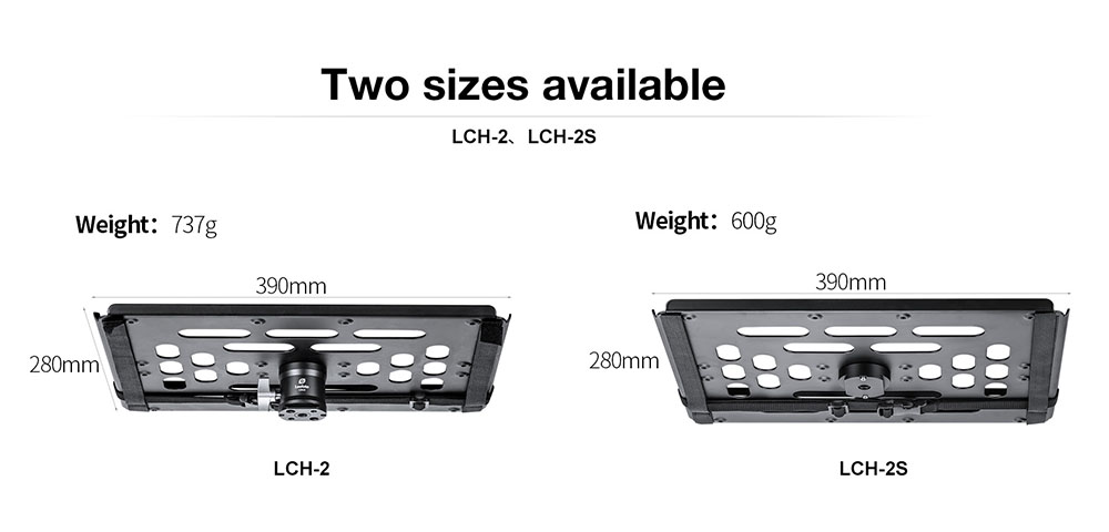 Với kích thước 280 x 390 mm, khay LCH-2S rộng rãi và có thể chứa được các loại laptop với kích thước lên đến 15,6 inch. Trọng lượng chỉ khoảng 600 g, giúp bạn dễ dàng mang theo nó bất cứ đâu mà không cảm thấy nặng nề. Leofoto LCH-2S, bạn sẽ có trải nghiệm làm việc đơn giản, tiện lợi và chuyên nghiệp hơn khi sử dụng laptop để xem và chỉnh sửa ảnh hoặc video trong chuyến đi của mình.