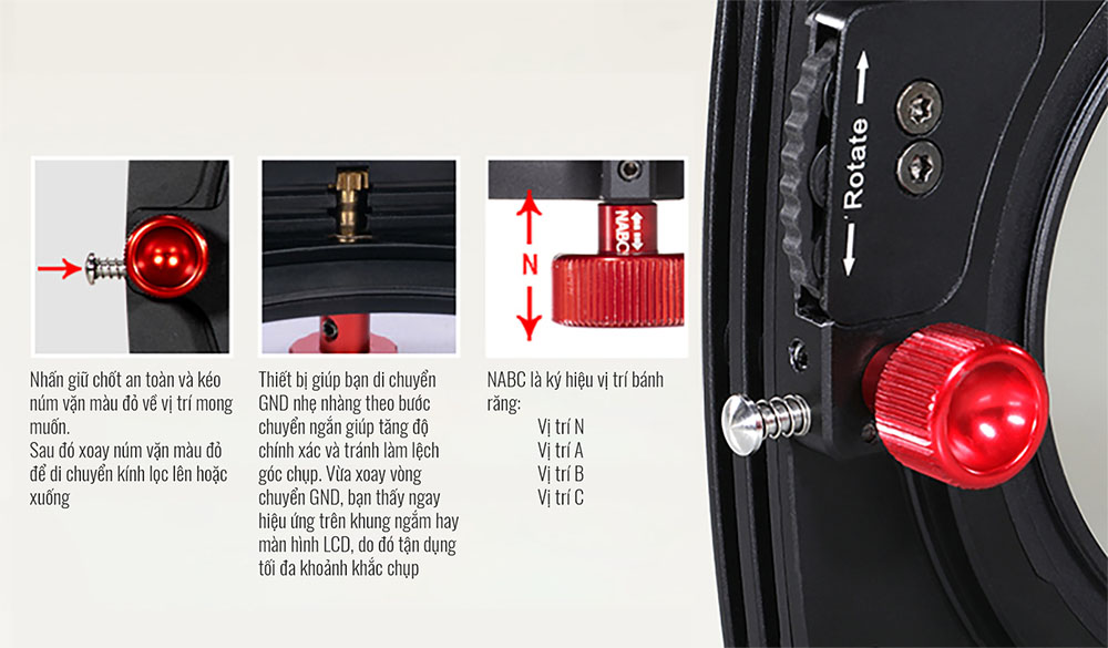 - 3 rãnh, giúp bạn gắn cùng lúc 3 kính lọc vuông
