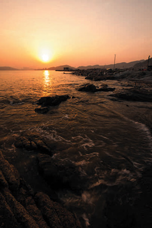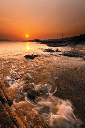 Trong hình ảnh gốc, mặt trời và mặt nước có sự phản chiếu ánh sáng mạnh. Người chụp dùng kính lọc GND REVERSE 0.9 để tô đậm vùng mặt trời, giúp cân bằng độ sáng giữa phần mặt trời và bức ảnh.
