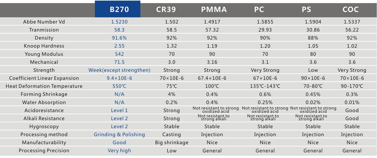 Kính quang học B270 sở hữu hiệu suất quang học cao, tính dẫn truyền ánh sáng cao, tính chất quang học ổn định, thường được sử dụng để sản xuất kính lọc trong ngành ảnh.