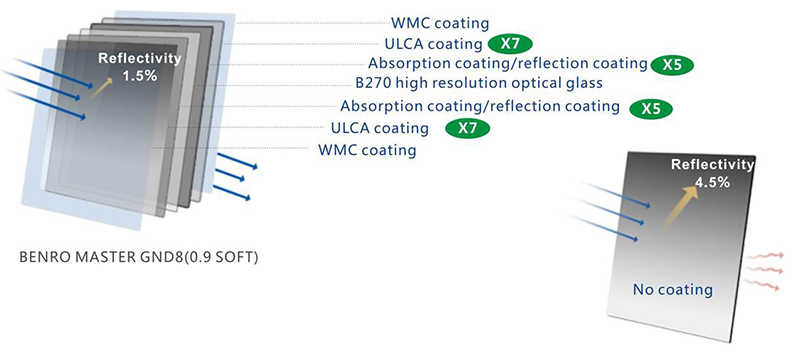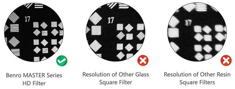 So sánh cho thấy, không thể cắt giảm 4.5% tỉ lệ phản chiếu bề mặt trên kính lọc vuông chất liệu nhựa vì lý do việc đưa một lớp phủ chống phản chiếu vào kính lọc vuông cần thực hiện dưới điều kiện nhiệt độ cao, mà nhựa quang học thì không thể chịu được điều kiện đó. Ở kính lọc vuông hệ Master của Benro, tỉ lệ phản chiếu bề mặt chỉ khoảng 1.5%.